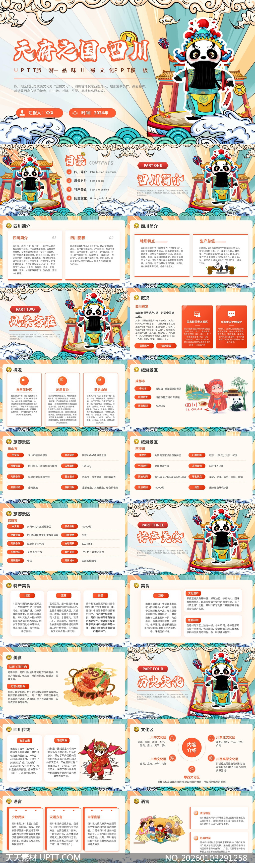 这款PPT模板以国潮插画风格生动呈现四川文旅魅力,融合熊猫、川剧脸谱等标志性元素,视觉活泼又具文化深度,内容模块涵盖地理概览、风景名胜、特色美食与历史人文,结构清晰逻辑严谨,适用于旅游推广、城市宣传、文化讲座及教学课件等多种场景,是高效传递“天府之国”独特韵味的视觉利器。【 素材唯一编号 20260103291258 】,中国风类红色风格PPTX格式素材下载,文件格式为.PPTX,下载完成后的文件为一个压缩包,素材压缩包大小20.66 MB,请解压后用相应软件打开。