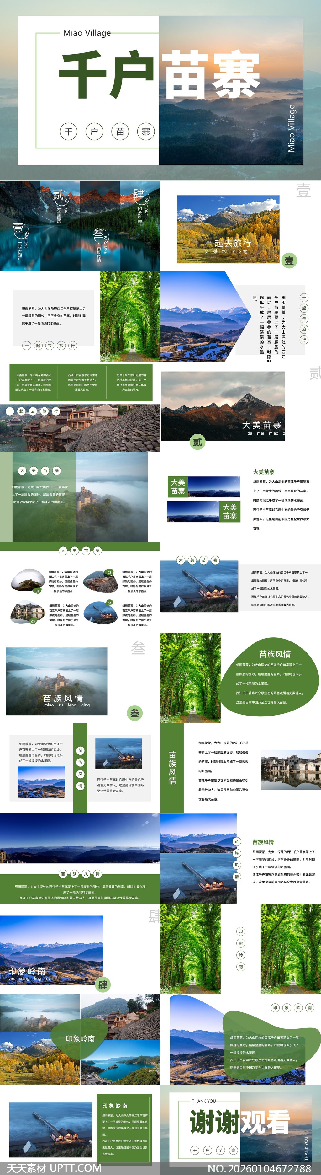 本PPT模板以西江千户苗寨的云雾山峦、古朴吊脚楼与浓郁民族元素为核心视觉,融合清新绿意与晨昏光影,营造诗意栖居氛围;采用模块化排版与自然纹理背景,适配旅游推广、文化汇报、民俗教学等场景,助力用户高效传递山水人文之美,让每一页都成为沉浸式旅行体验的窗口。【 素材唯一编号 20260104672788 】,自然类绿色风格PPTX格式素材下载,文件格式为.PPTX,下载完成后的文件为一个压缩包,素材压缩包大小13.91 MB,请解压后用相应软件打开。