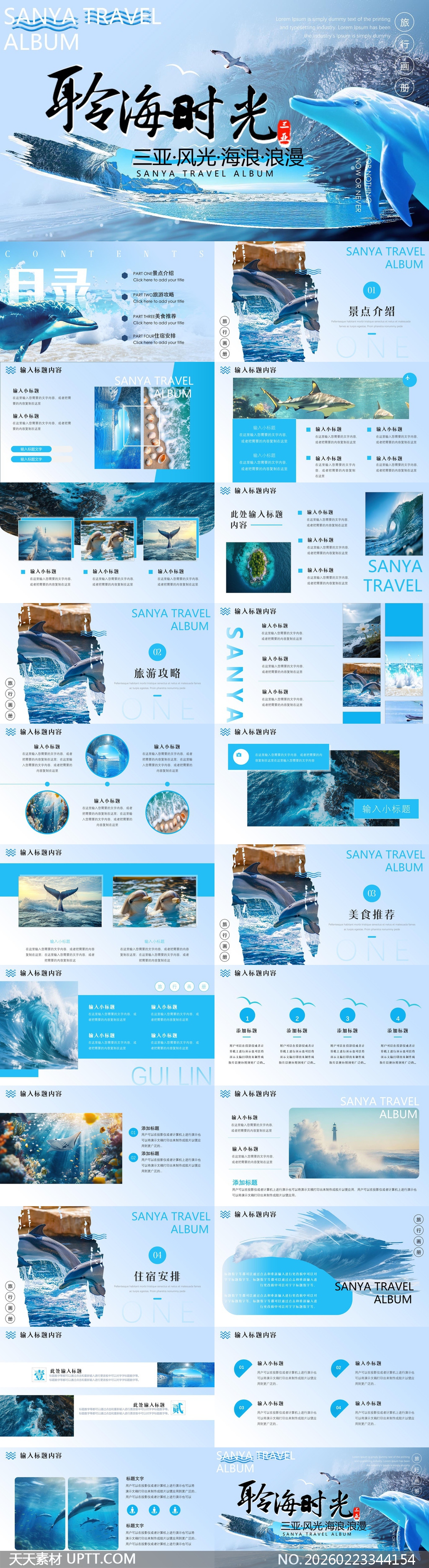 本PPT模板以清新浪漫的蓝色海洋风为基调,融合海豚、浪花、贝壳与三亚实景图等视觉元素,营造出沉浸式度假氛围;结构清晰划分为景点介绍、旅游攻略、美食推荐与住宿安排四大模块;适用于旅行社产品推介、高校文旅课程汇报、个人旅行分享或企业团建方案展示,兼具专业性与艺术感,助您高效打造高质感旅行主题演示文稿。【 素材唯一编号 20260223344154 】,简约类蓝色风格PPTX格式素材下载,文件格式为.PPTX,下载完成后的文件为一个压缩包,素材压缩包大小42.39 MB,请解压后用相应软件打开。