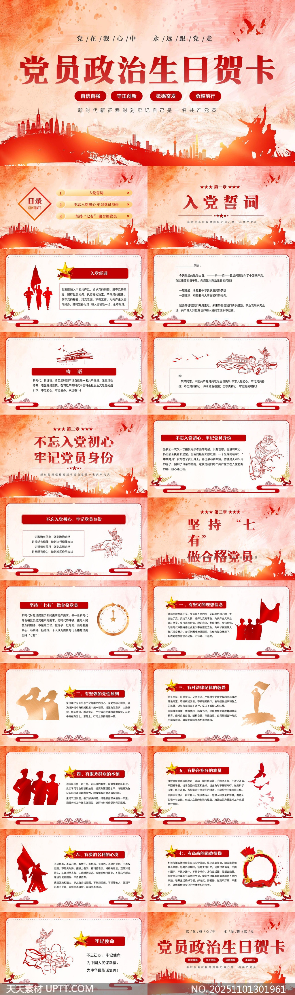 本模板突出“不忘初心、牢记使命忘记党员身份”主题,适用于党组织开展政治生日庆祝活动、党员教育学习及组织生活会等场景,内容涵盖入党誓词、七有标准、党员使命等核心模块,图文并茂、结构清晰,便于快速编辑使用,助力提升党性教育仪式感与感染力。【 素材唯一编号 20251101301961 】,党建类红色风格PPTX格式素材下载,文件格式为.PPTX,下载完成后的文件为一个压缩包,素材压缩包大小69.09 MB,请解压后用相应软件打开。