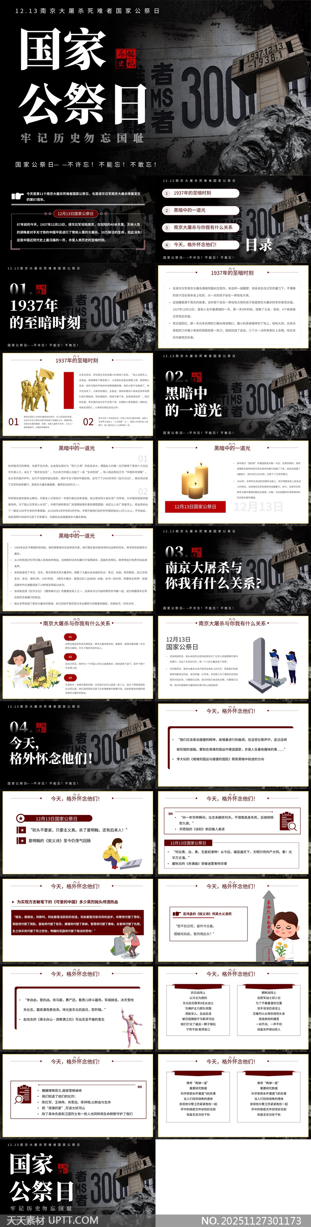 本PPT模板以庄重肃穆的视觉风格呈现南京大屠杀国家公祭日主题,融合历史影像、象征性元素与现代排版设计,突出“铭记历史、勿忘国耻”的核心理念。采用黑白灰主色调搭配红色警示点缀,增强情感冲击力,适用于学校教育、爱国主义主题教育、纪念活动演讲等场景,帮助用户深刻传递历史记忆与民族精神,兼具思想性与艺术性。【 素材唯一编号 20251127301173 】,党建类黑白灰风格PPTX格式素材下载,文件格式为.PPTX,下载完成后的文件为一个压缩包,素材压缩包大小5.26 MB,请解压后用相应软件打开。