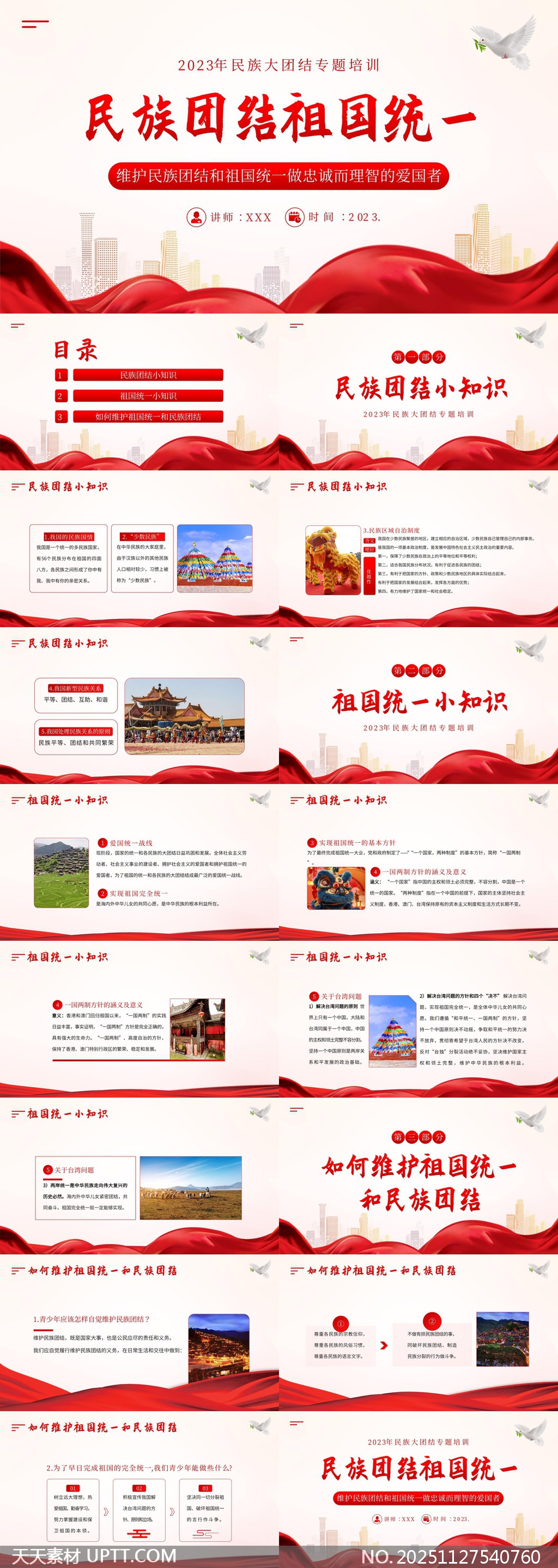 本PPT模板以突出民族团结与祖国统一的主题氛围。涵盖民族团结小知识、祖国统一基础知识及青少年如何践行爱国责任三大模块,图文并茂,适合用于学校、机关单位开展爱国主义教育、主题党日活动或思想政治培训,助力高效传递核心价值观,增强集体凝聚力与国家认同感。【 素材唯一编号 20251127540760 】,党建类红色风格PPTX格式素材下载,文件格式为.PPTX,下载完成后的文件为一个压缩包,素材压缩包大小15.94 MB,请解压后用相应软件打开。