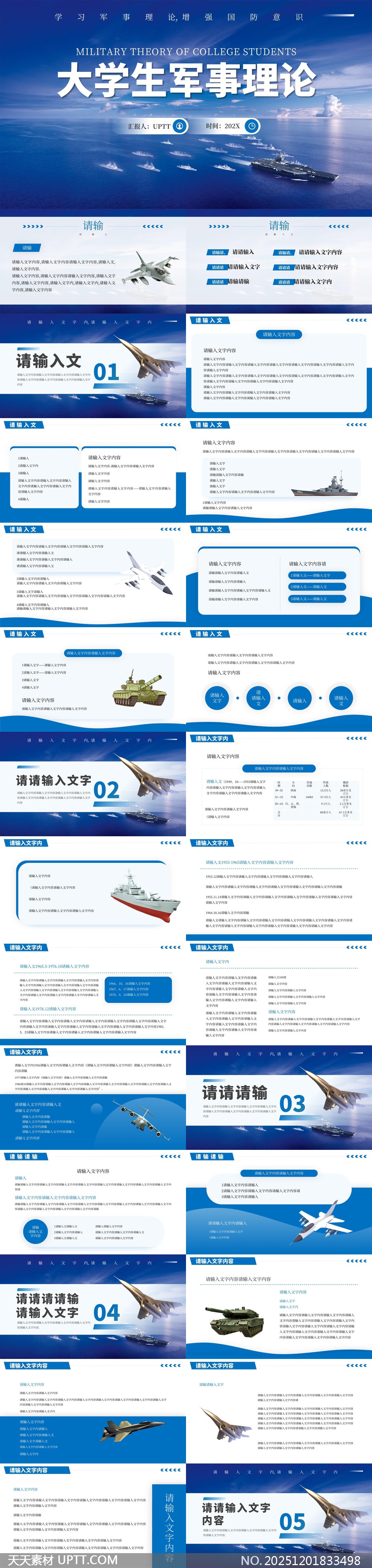本PPT模板以深邃蓝色海洋为设计基调,融合舰艇、战机、坦克等军事元素,展现现代国防力量的磅礴气势,整体风格庄重大气、科技感十足,适用于高校军事理论课程教学、国防教育讲座及主题汇报展示,搭配清晰排版与动态视觉效果,助力教师高效传达课程内容,提升课堂感染力与专业度。【 素材唯一编号 20251201833498 】,政务类蓝色风格PPTX格式素材下载,文件格式为.PPTX,下载完成后的文件为一个压缩包,素材压缩包大小13.18 MB,请解压后用相应软件打开。