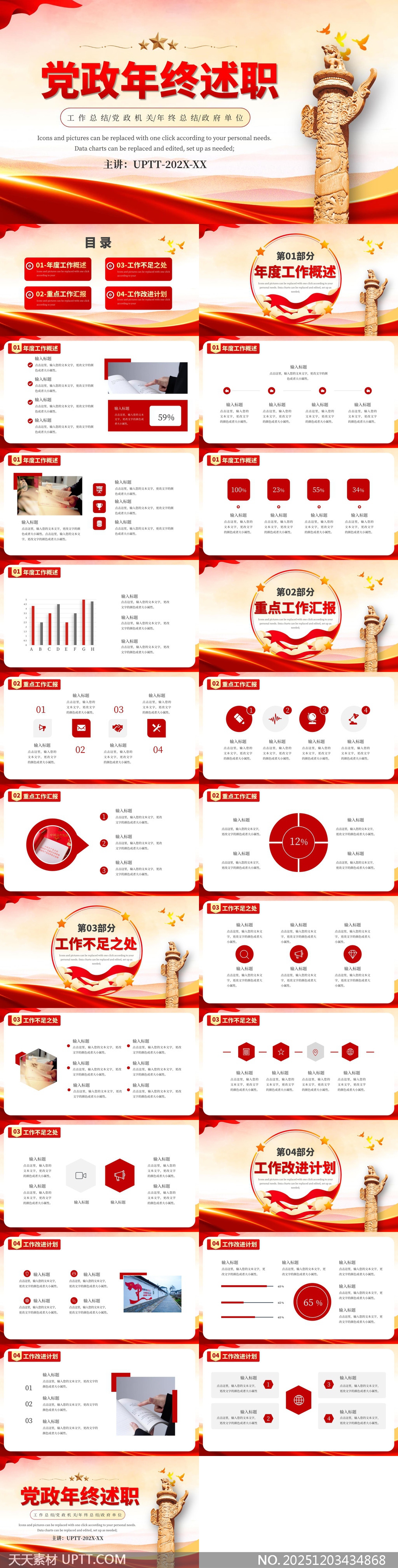 本模板专为党政机关及政府单位设计,内含年度概述、重点工作、不足分析及改进计划四大模块,搭配图表、图标与数据可视化组件,适用于年终述职、工作总结及汇报展示场景,助力高效呈现工作成果与规划。【 素材唯一编号 20251203434868 】,党建类红色风格PPTX格式素材下载,文件格式为.PPTX,下载完成后的文件为一个压缩包,素材压缩包大小4.44 MB,请解压后用相应软件打开。