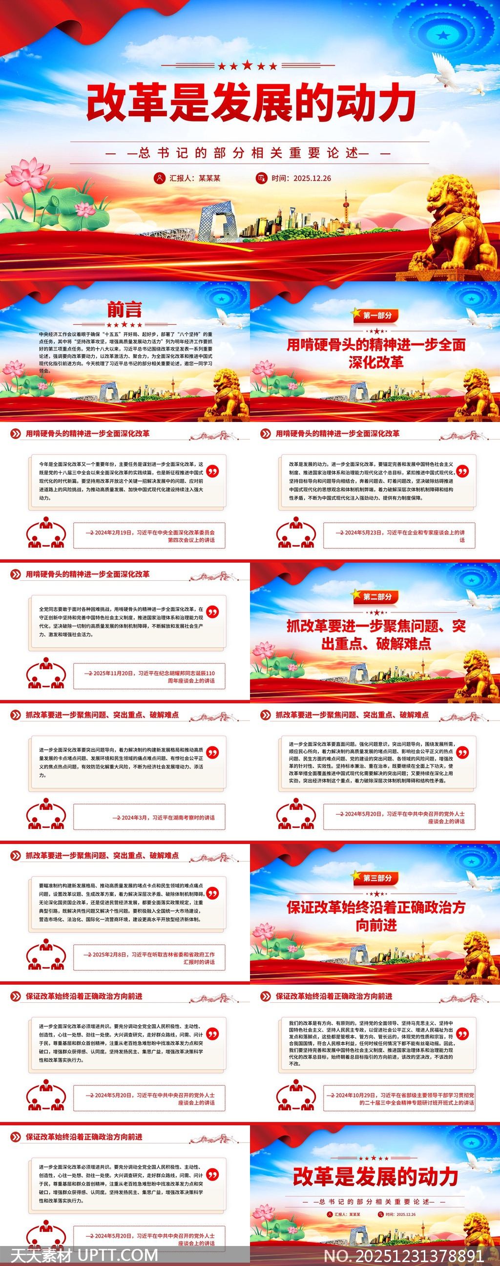 本PPT模板以“改革是发展的动力”为核心主题,结构清晰分三大部分层层递进,每页均配权威讲话引文与图文排版模块,适用于党政机关年度改革汇报、政策解读会议及主题教育宣讲场景,助力高效传达深化改革战略思想,提升汇报专业性与感染力。【 素材唯一编号 20251231378891 】,党建类红色风格PPTX格式素材下载,文件格式为.PPTX,下载完成后的文件为一个压缩包,素材压缩包大小16.36 MB,请解压后用相应软件打开。