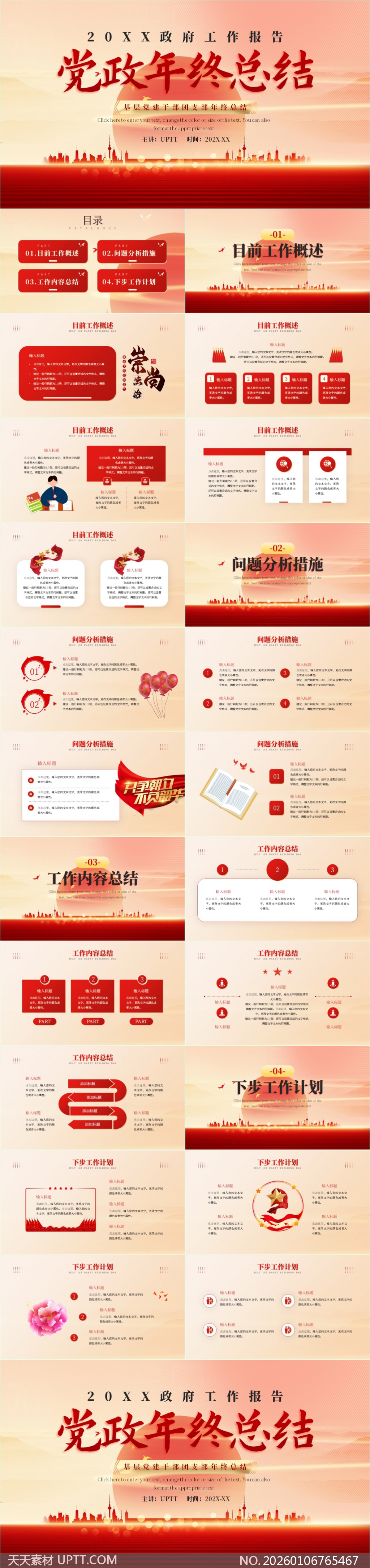 本模板专为党政机关、基层党组织及国企单位设计,适用于年度工作总结、述职汇报、党建会议等正式场合,内含目录、工作概述、问题分析、内容总结、计划展望等完整模块,彰显组织权威与工作成果。【 素材唯一编号 20260106765467 】,党建类红色风格PPTX格式素材下载,文件格式为.PPTX,下载完成后的文件为一个压缩包,素材压缩包大小5.21 MB,请解压后用相应软件打开。