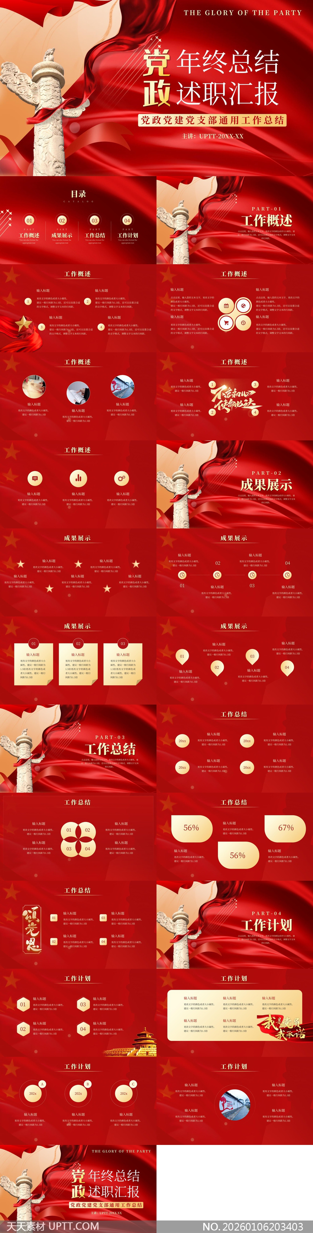 本模板内置工作概述、成果展示、总结与计划四大模块及多款数据图表页,结构清晰逻辑严谨,专为党政机关、企事业单位年终述职、党支部汇报等正式场合设计,助您高效打造专业规范的汇报材料,彰显组织形象与工作实绩。【 素材唯一编号 20260106203403 】,素材下载,文件格式为.PPTX,下载完成后的文件为一个压缩包,素材压缩包大小9.26 MB,请解压后用相应软件打开。