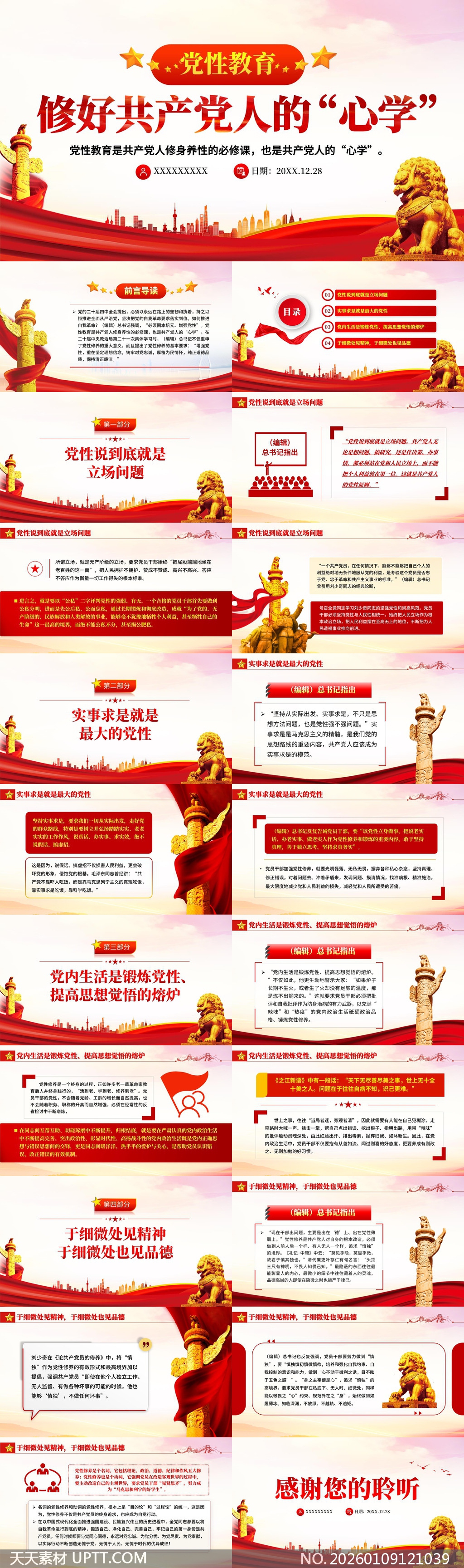 本PPT模板四大部分深入阐释党性修养核心要义,内嵌总书记语录与经典论述,适配党政机关、党校培训、支部学习等场景,助力讲好“心学”课程,提升思想教育感染力与专业度,是开展党性教育的高效可视化工具。【 素材唯一编号 20260109121039 】,党建类红色风格PPTX格式素材下载,文件格式为.PPTX,下载完成后的文件为一个压缩包,素材压缩包大小13.66 MB,请解压后用相应软件打开。