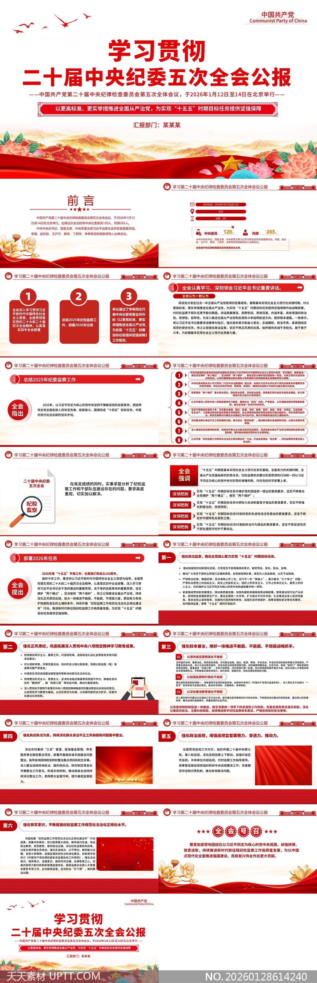 本素材为党政机关学习贯彻二十届中央纪委五次全会精神的高质量PPT模板,适用于各级党组织专题学习、纪委系统培训、民主生活会汇报及党建宣传展陈等场景,兼具政治严肃性与演示专业性,助力高效传达会议精神与工作部署。【 素材唯一编号 20260128614240 】,党建类红色风格PPTX格式素材下载,文件格式为.PPTX,下载完成后的文件为一个压缩包,素材压缩包大小25.49 MB,请解压后用相应软件打开。