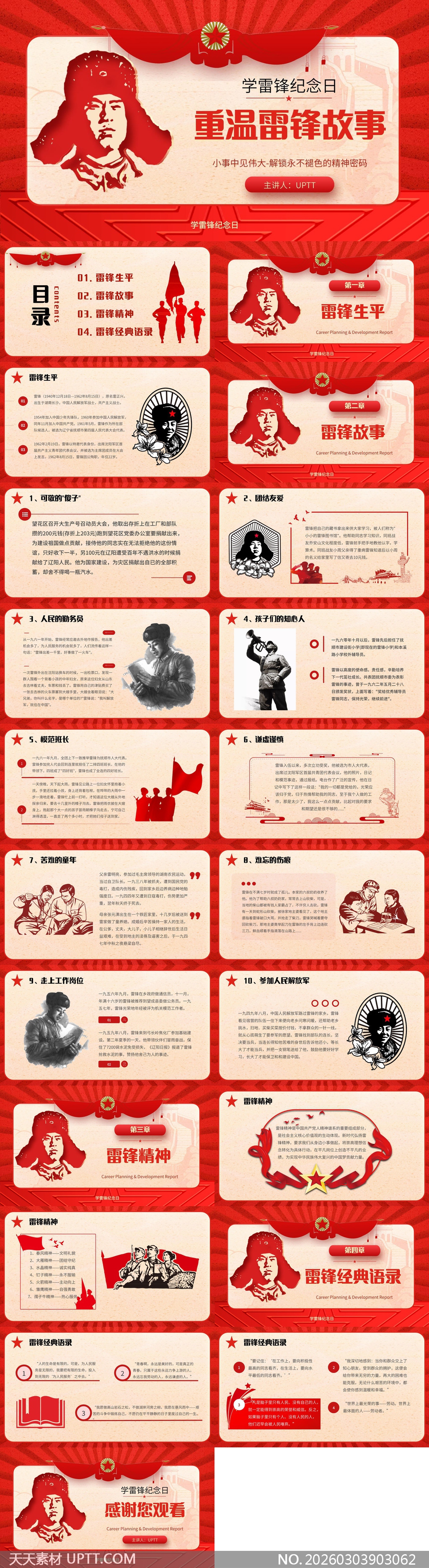 本模板采用鲜明红色剪纸艺术风格,融合雷锋肖像、五角星、红旗等经典视觉元素,营造庄重而富有感染力的红色文化氛围;涵盖生平事迹、感人故事、精神内涵与经典语录四大模块,配以手绘插图与复古纹理背景,增强历史感与教育性;适用于学校思政课堂、机关单位主题党日、社区志愿服务宣讲及青年团员学习活动等场景,既可作为教学课件,也适合作为纪念展陈素材,助力弘扬雷锋精神,传递向上向善的价值观。【 素材唯一编号 20260303903062 】,党建类红色风格PPTX格式素材下载,文件格式为.PPTX,下载完成后的文件为一个压缩包,素材压缩包大小15.29 MB,请解压后用相应软件打开。