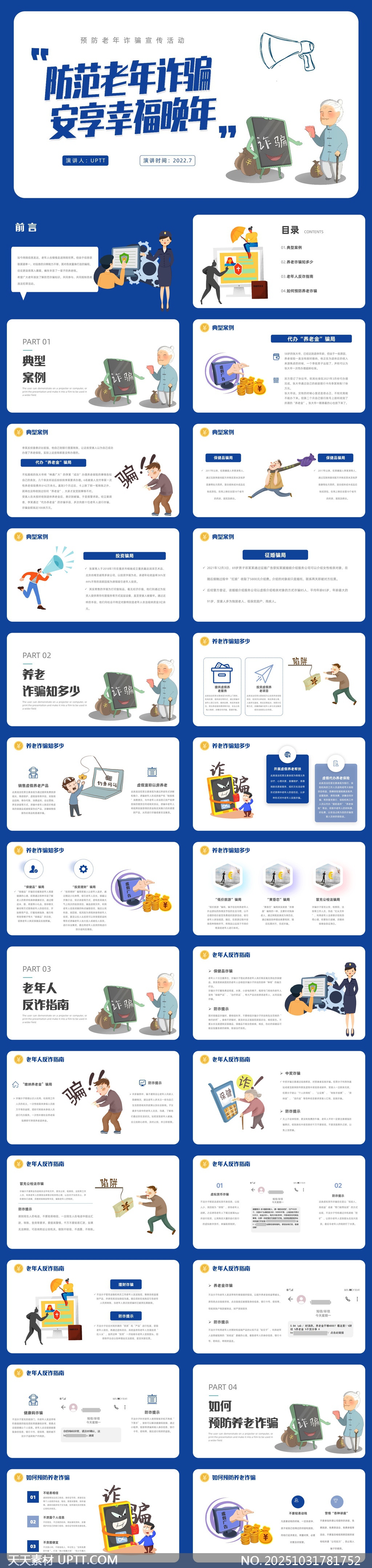 该PPT模板以蓝色为主色调,搭配生动插画与清晰排版,系统呈现老年诈骗典型案例、常见套路及防范措施,内容涵盖“养生骗局”“投资陷阱”“保健品营销”等真实场景,结合图文并茂的反诈指南与实用建议,适用于社区宣传、养老机构培训、公益讲座等场景,帮助老年人增强防骗意识,提升自我保护能力,助力构建安全和谐的晚年生活环境。【 素材唯一编号 20251031781752 】,插画类蓝色风格PPTX格式素材下载,文件格式为.PPTX,下载完成后的文件为一个压缩包,素材压缩包大小21.61 MB,请解压后用相应软件打开。