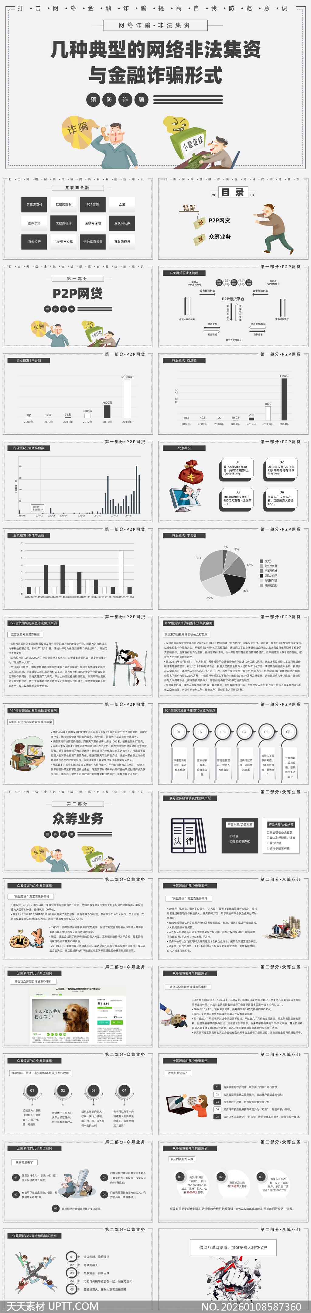 本PPT模板以清晰结构与生动插画直观剖析P2P网贷、众筹等典型金融诈骗手法,融合数据图表、真实案例与法律条文,兼具专业性与传播力,适用于企业内训、社区普法、校园安全教育等场景,帮助受众快速识别陷阱、提升风险防范意识,是开展金融安全宣教工作的实用视觉工具。【 素材唯一编号 20260108587360 】,政务类黑白灰风格PPTX格式素材下载,文件格式为.PPTX,下载完成后的文件为一个压缩包,素材压缩包大小58.41 MB,请解压后用相应软件打开。