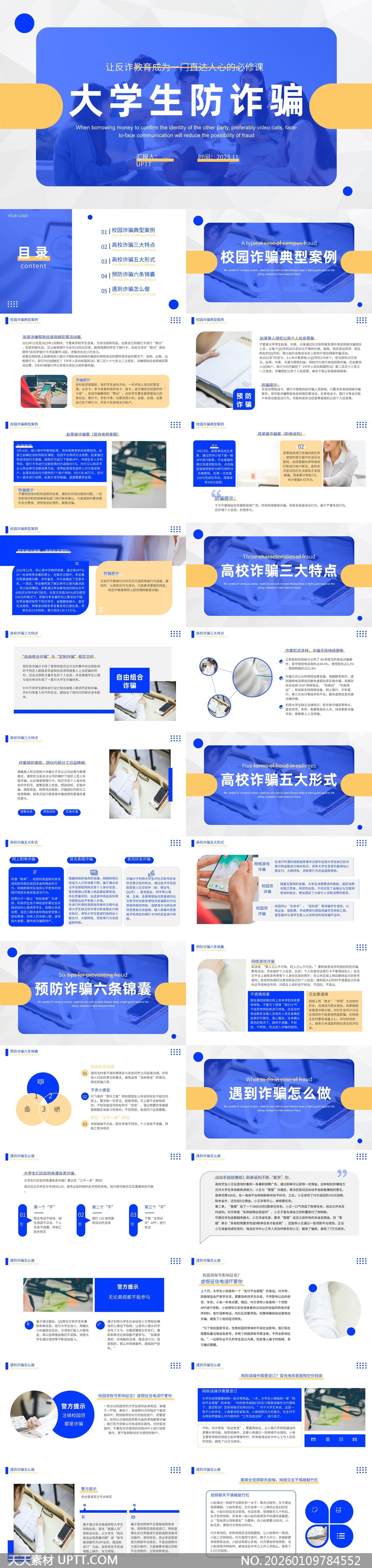 专为高校安全教育设计的防诈主题PPT模板,采用蓝黄撞色视觉体系,结构清晰涵盖典型案例、诈骗特点、防范锦囊与应急指南,图文并茂结合真实场景图示与警示语录,适配班会、讲座、新生入学教育等场景,助力辅导员高效开展反诈宣传,提升学生风险识别与自我保护能力,是校园安全教育的实用可视化工具。【 素材唯一编号 20260109784552 】,简约类蓝色风格PPTX格式素材下载,文件格式为.PPTX,下载完成后的文件为一个压缩包,素材压缩包大小56.3 MB,请解压后用相应软件打开。