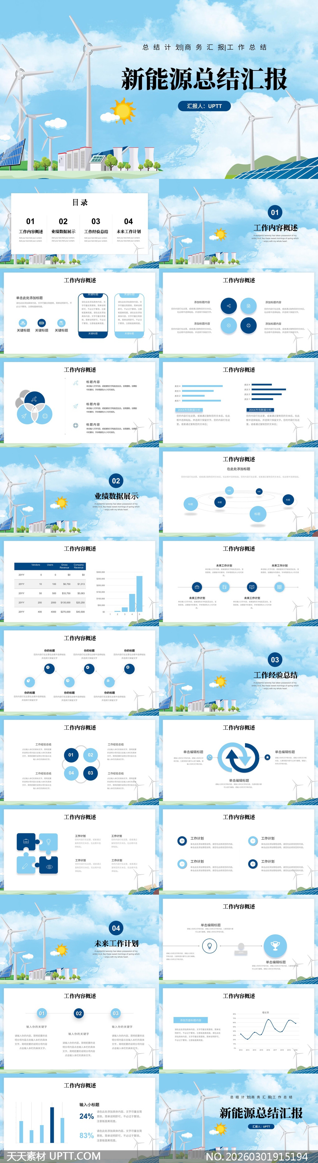 本PPT模板以清新蓝绿主色调搭配手绘风风力发电机、太阳能板与城市生态景观,营造专业又富有活力的绿色能源视觉氛围;适配环保企业年度总结、新能源项目汇报、政府双碳工作述职及高校课题答辩等场景,助力高效制作兼具专业性与传播力的汇报材料。【 素材唯一编号 20260301915194 】,简约类蓝色风格PPTX格式素材下载,文件格式为.PPTX,下载完成后的文件为一个压缩包,素材压缩包大小35.43 MB,请解压后用相应软件打开。