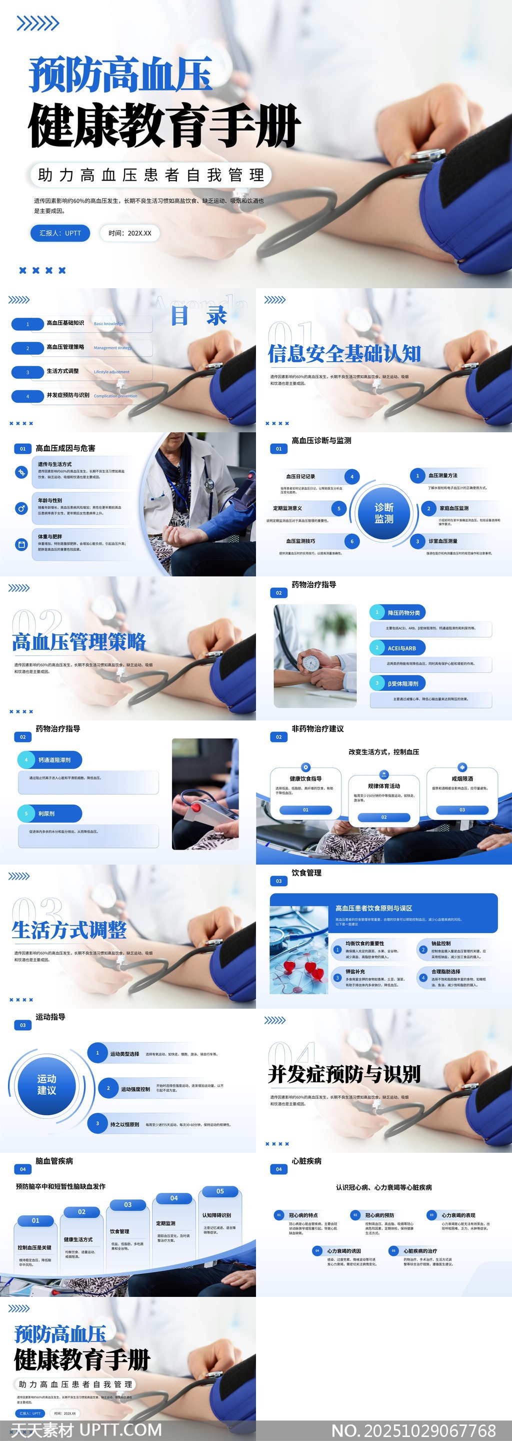 本PPT模板专为高血压健康教育设计,采用清新蓝白配色与真实医疗场景图片,突出专业性与亲和力,内容涵盖病因、诊断监测、药物与非药物治疗、生活方式调整及并发症预防等核心模块,适用于医院健康讲座、社区卫生宣教、医学院校教学等多种场景,助力医护人员高效开展患者健康指导与自我管理培训。【 素材唯一编号 20251029067768 】,简约类蓝色风格PPTX格式素材下载,文件格式为.PPTX,下载完成后的文件为一个压缩包,素材压缩包大小7.08 MB,请解压后用相应软件打开。