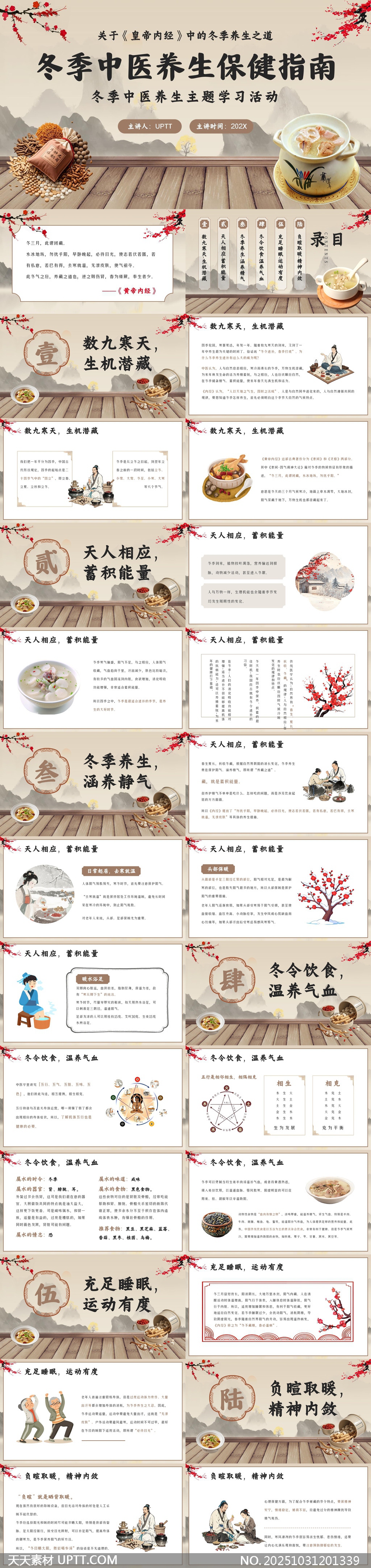 本PPT模板以传统中医养生理念为核心,融合冬季养生主题,采用古风插画与典雅配色,展现“数九寒天、天人相应、温养气血”等经典养生原则,搭配中药材、汤羹、太极等元素,视觉层次丰富,文化氛围浓厚,适用于健康讲座、中医科普、养生培训等场景,帮助用户轻松呈现专业且富有文化底蕴的冬季保健知识。【 素材唯一编号 20251031201339 】,中国风类红色风格PPTX格式素材下载,文件格式为.PPTX,下载完成后的文件为一个压缩包,素材压缩包大小48.96 MB,请解压后用相应软件打开。