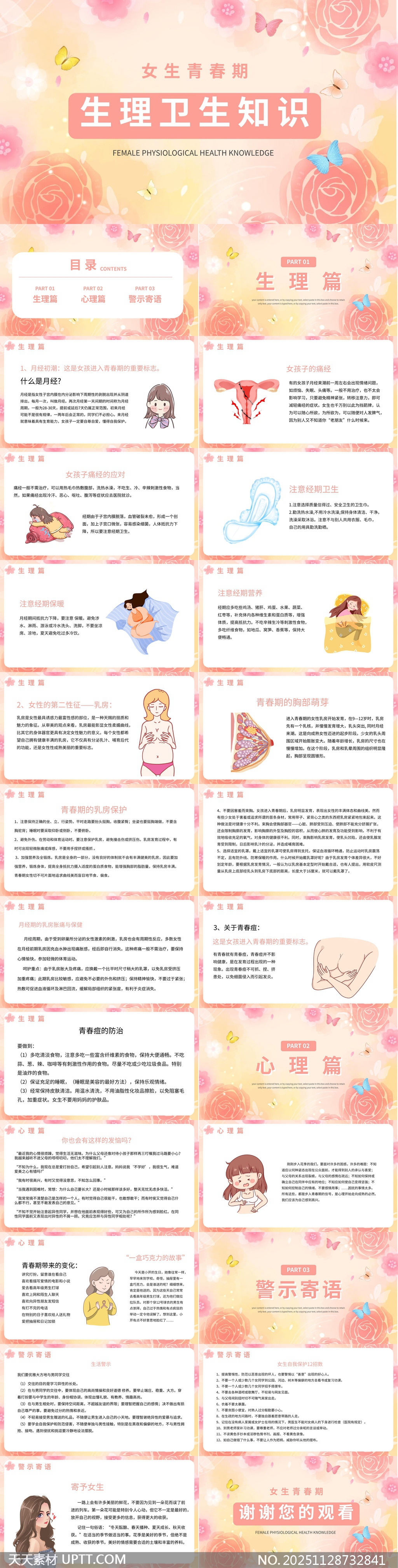 本PPT模板以清新柔和的粉色系为主调,结合卡通插画与简洁排版,生动呈现女生青春期生理与心理变化知识,内容涵盖月经常识、乳房发育、情绪管理及自我保护等关键主题,兼具科学性与亲和力,适合学校健康教育课、家长辅导或青少年科普讲座使用,帮助女孩正确认识成长过程中的身心变化,培养健康积极的生活态度。【 素材唯一编号 20251128732841 】,卡通类红色风格PPTX格式素材下载,文件格式为.PPTX,下载完成后的文件为一个压缩包,素材压缩包大小3.66 MB,请解压后用相应软件打开。