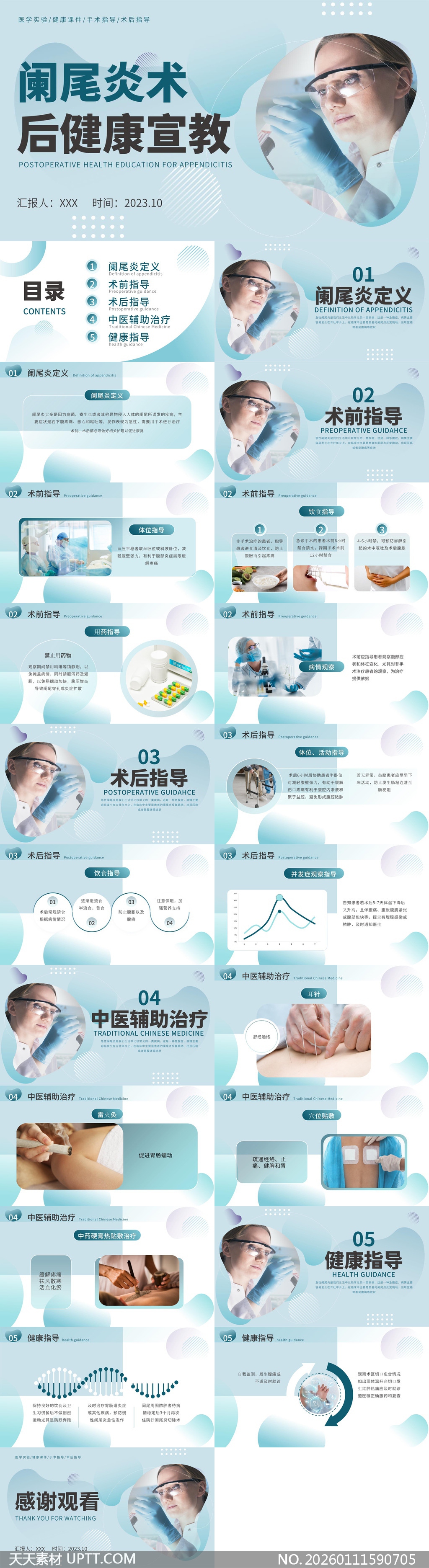 本PPT模板以清新蓝白医疗风设计,融合现代医学与中医辅助疗法,系统涵盖术前准备、术后护理、饮食用药、并发症观察及耳针/艾灸等传统疗法指导,适用于医院宣教、医护培训或患者康复科普场景,专业实用且视觉亲和,助力提升术后健康教育效率与患者依从性。【 素材唯一编号 20260111590705 】,简约类蓝色风格PPTX格式素材下载,文件格式为.PPTX,下载完成后的文件为一个压缩包,素材压缩包大小76.95 MB,请解压后用相应软件打开。