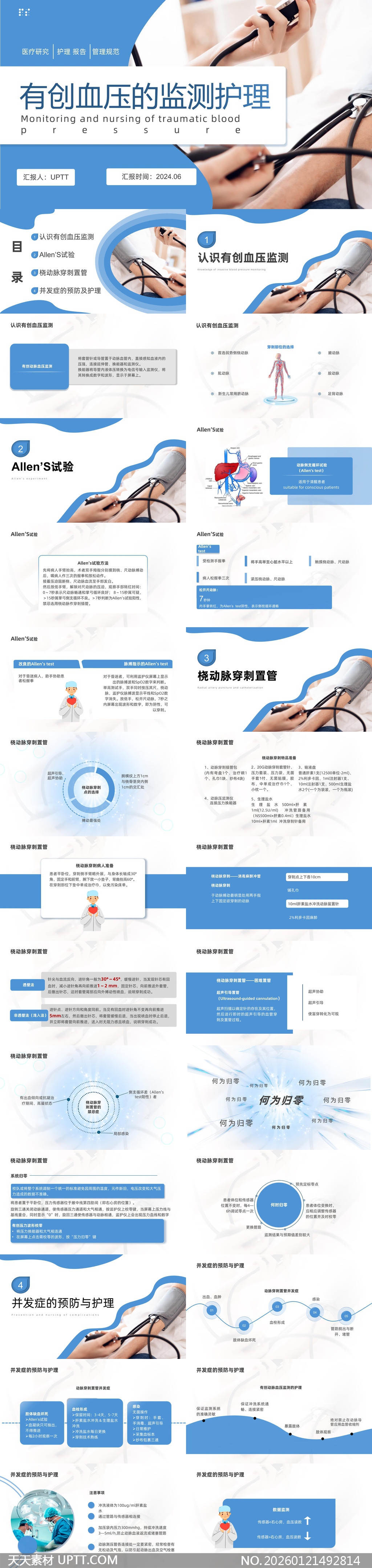 本PPT模板专为临床医护培训与教学设计,采用清新蓝白配色与医疗实景图结合,内容涵盖有创血压监测原理、Allen’s试验操作、桡动脉穿刺置管全流程及并发症预防要点,适配医院科室培训、护理教学汇报及学术交流场景,助力提升专业护理规范与风险防控能力。【 素材唯一编号 20260121492814 】,简约类蓝色风格PPTX格式素材下载,文件格式为.PPTX,下载完成后的文件为一个压缩包,素材压缩包大小8.05 MB,请解压后用相应软件打开。