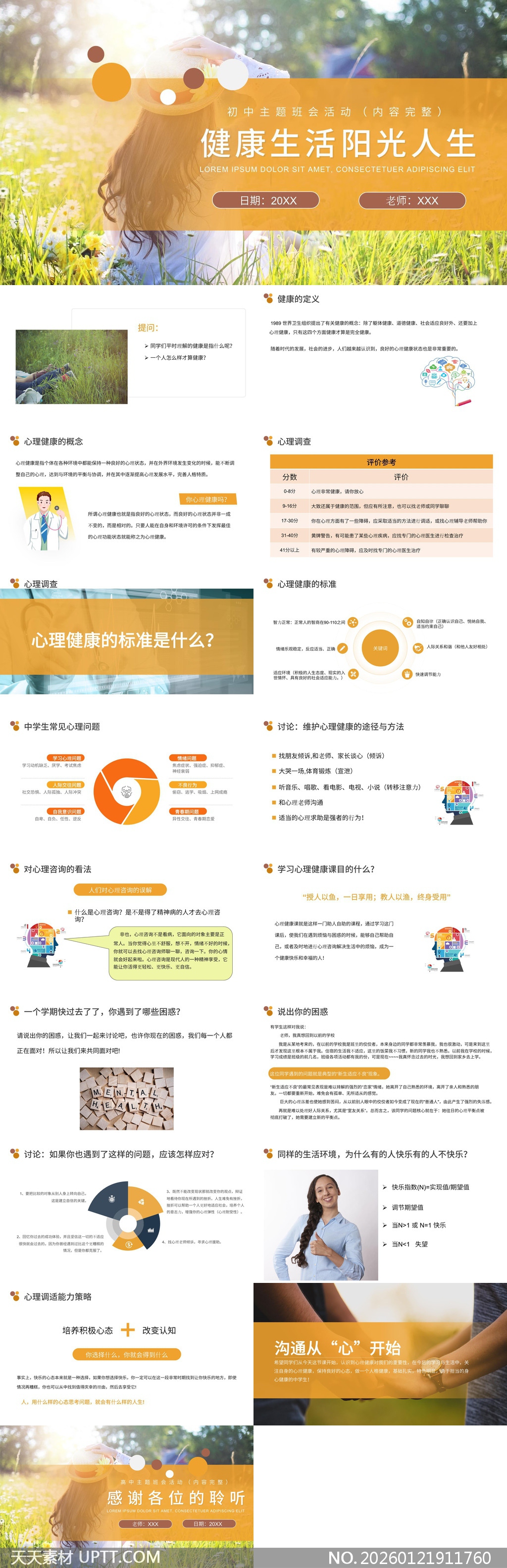 本PPT模板以温暖阳光的自然影像为视觉基调,融合橙黄主色调与清新插画,营造积极向上的心理教育氛围;内容结构完整,涵盖心理健康定义、常见问题识别、自评量表、调适策略及互动讨论环节,特别设置“说出你的困惑”“沟通从‘心’开始”等实操性强的板块,辅以饼图、脑图、文字云等可视化元素提升理解力;适用于初中阶段主题班会、心理课程教学或校园心理健康周活动,支持教师灵活编辑替换案例与数据,助力学生在共情与思辨中建立积极心态与自我认知能力。【 素材唯一编号 20260121911760 】,自然类黄色风格PPTX格式素材下载,文件格式为.PPTX,下载完成后的文件为一个压缩包,素材压缩包大小8.72 MB,请解压后用相应软件打开。