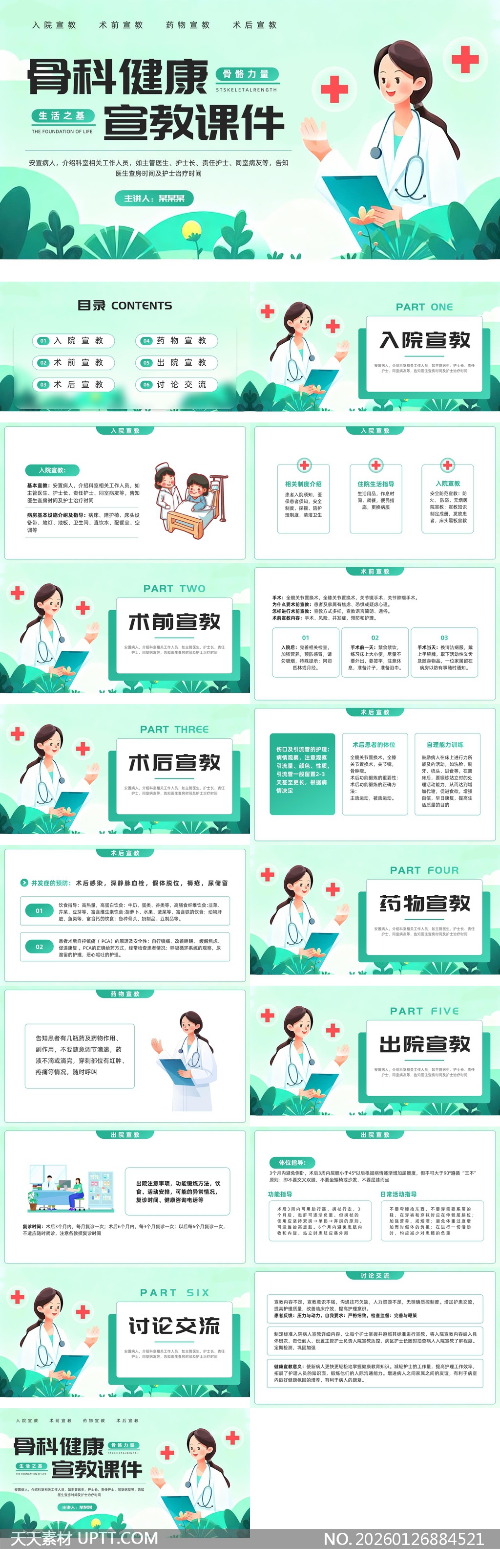 本PPT模板采用清新绿色主调与手绘插画风格,营造温馨专业医疗氛围,内容系统覆盖入院、术前、术后、药物及出院全流程宣教要点,并融入讨论交流环节增强互动性;适用于骨科病房健康教育讲座、新患者入院指导、护理人员培训及医患沟通场景,呈现关键护理措施与康复要点,兼顾科学性与可读性,助力提升宣教效率与患者依从性。【 素材唯一编号 20260126884521 】,插画类绿色风格PPTX格式素材下载,文件格式为.PPTX,下载完成后的文件为一个压缩包,素材压缩包大小15.95 MB,请解压后用相应软件打开。