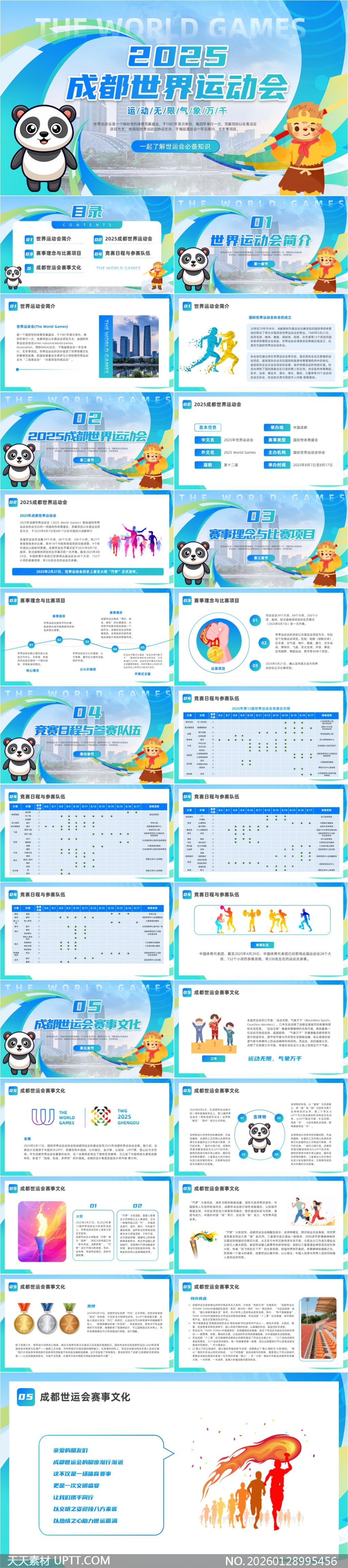 本PPT模板以蓝绿渐变主色调融合熊猫、川剧脸谱、竹子等成都文化元素,搭配活泼手绘插画与现代信息图表,视觉清新富有地域特色;内容结构清晰,涵盖世运会起源、2025成都赛事概况、项目设置、赛程安排及参赛队伍数据表,并深度融入“运动无限,气象万千”主题文化阐释;适用于政府汇报、高校宣讲、企业宣传及赛事筹备会议等场景,助力高效呈现世界级体育盛会的精彩与底蕴。【 素材唯一编号 20260128995456 】,插画类蓝色风格PPTX格式素材下载,文件格式为.PPTX,下载完成后的文件为一个压缩包,素材压缩包大小16.38 MB,请解压后用相应软件打开。