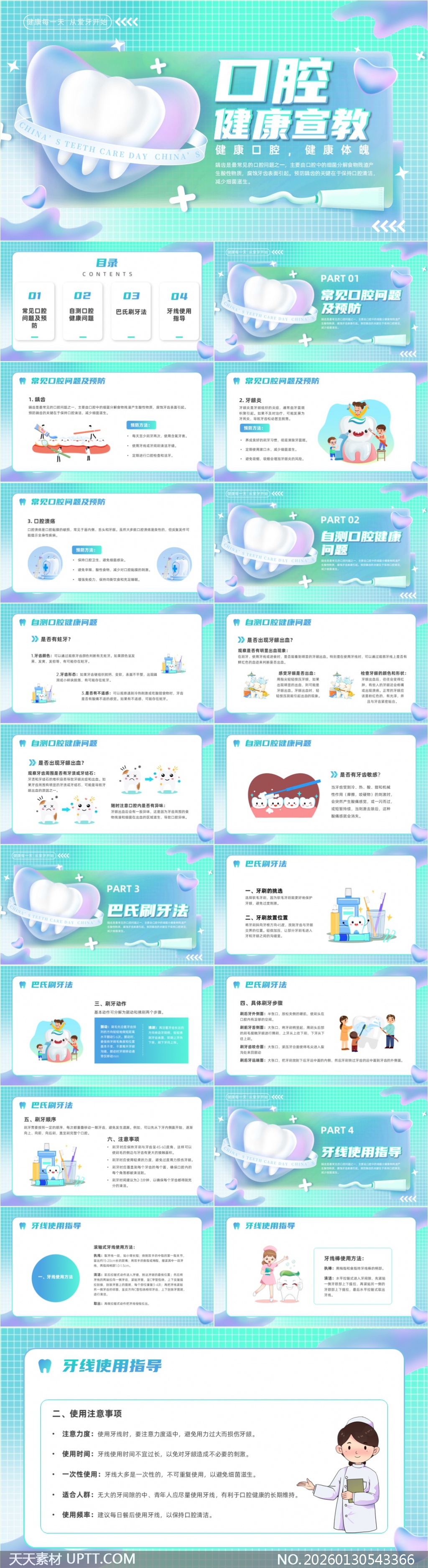 本PPT模板采用清新蓝绿渐变插画风格,融合3D牙齿模型、卡通医护形象与步骤分解图示,视觉直观易懂;内容系统涵盖龋齿、牙龈炎等常见问题识别与预防策略,创新加入“自测口腔健康”互动环节,强化用户参与感;巴氏刷牙法与牙线使用分步详解配以动态动作示意,操作要点一目了然;适用于社区义诊宣教、学校健康课程、牙科诊所患者教育及企业员工健康管理培训等场景,兼具专业性与传播力,助力高效开展口腔健康科普工作。【 素材唯一编号 20260130543366 】,简约类蓝色风格PPTX格式素材下载,文件格式为.PPTX,下载完成后的文件为一个压缩包,素材压缩包大小12.76 MB,请解压后用相应软件打开。