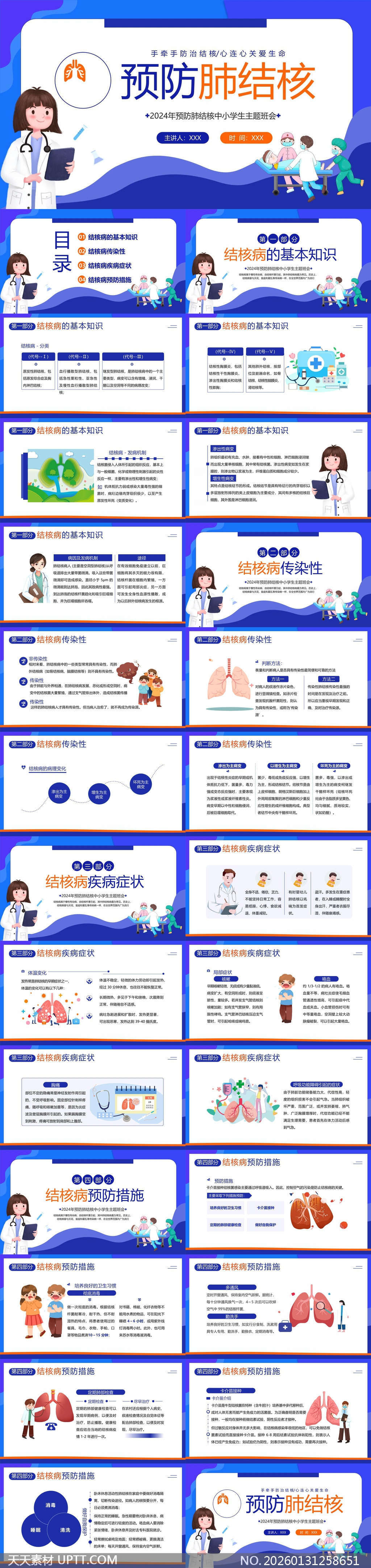 本PPT模板以蓝白主色调搭配清新插画风格,融合卡通医生、学生及肺部医学图示等可视化元素,分为基础知识、传染性、症状与预防四大模块,内容严谨科学且语言通俗易懂;每页均配备逻辑图解、流程图与情景漫画,增强中小学生理解力与参与感;适用于学校健康教育课、主题班会、卫生宣传周等活动场景,支持教师快速编辑讲授,兼具专业性、教育性与亲和力,助力青少年树立“早发现、早治疗、重预防”的结核病防控意识。【 素材唯一编号 20260131258651 】,插画类蓝色风格PPTX格式素材下载,文件格式为.PPTX,下载完成后的文件为一个压缩包,素材压缩包大小22.09 MB,请解压后用相应软件打开。