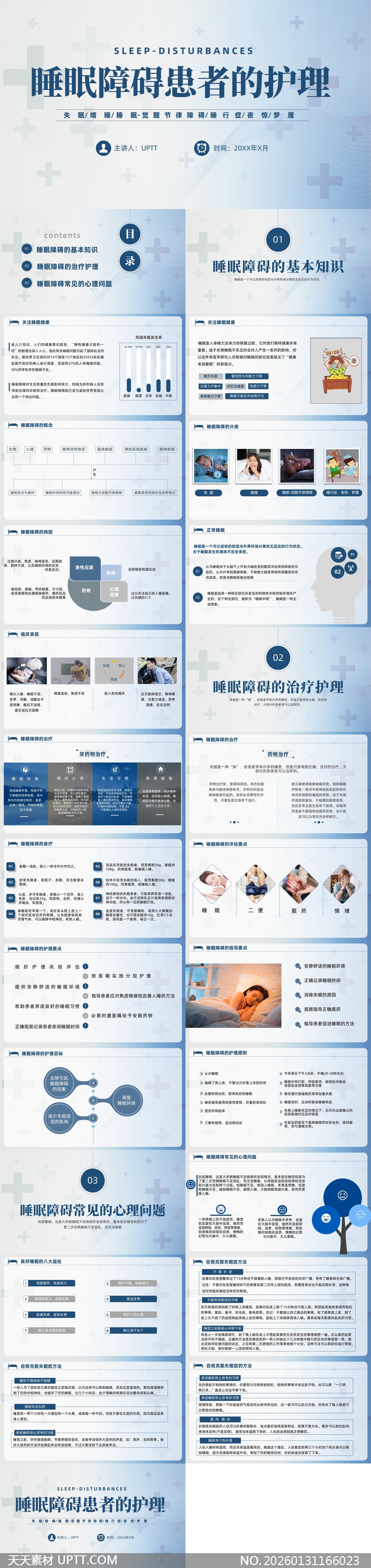 本PPT模板采用清新蓝白配色与医学插图结合的设计风格,涵盖睡眠障碍的定义分类、病因机制、临床表现、非药物与药物干预、护理要点及心理问题应对等核心内容;适用于医护人员培训、医学生教学、社区健康宣教及医院科室讲座等场景,兼顾科学性与实用性,助力高效传递睡眠健康管理知识。【 素材唯一编号 20260131166023 】,简约类蓝色风格PPTX格式素材下载,文件格式为.PPTX,下载完成后的文件为一个压缩包,素材压缩包大小15.61 MB,请解压后用相应软件打开。