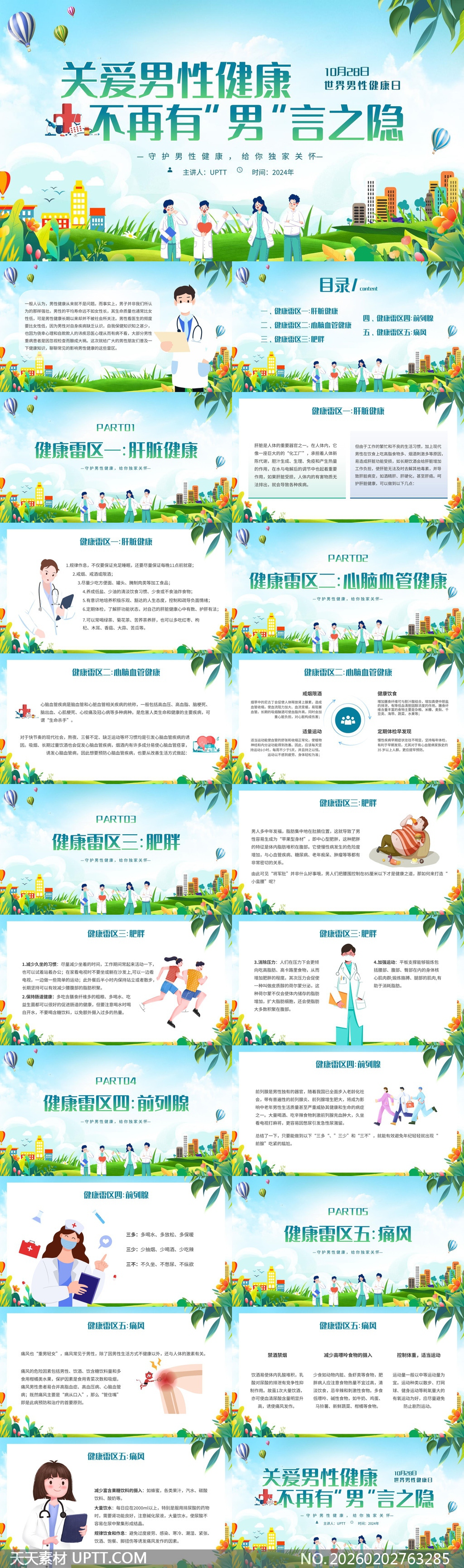 本PPT模板采用清新明快的插画风格,以绿色生态城市为背景,融合医生、患者、运动等生动角色与热气球、绿植等元素,营造温暖关怀氛围;内容系统覆盖肝胆、心脑血管、肥胖、前列腺及痛风五大男性高发健康问题,每部分均配有科学建议与生活干预方案;适配世界男性健康日宣传、社区健康讲座、企业EAP员工关爱活动及医学院校科普教学等场景,兼具专业性与传播力,助力提升男性健康意识与行动力。【 素材唯一编号 20260202763285 】,插画类红色风格PPTX格式素材下载,文件格式为.PPTX,下载完成后的文件为一个压缩包,素材压缩包大小37.52 MB,请解压后用相应软件打开。