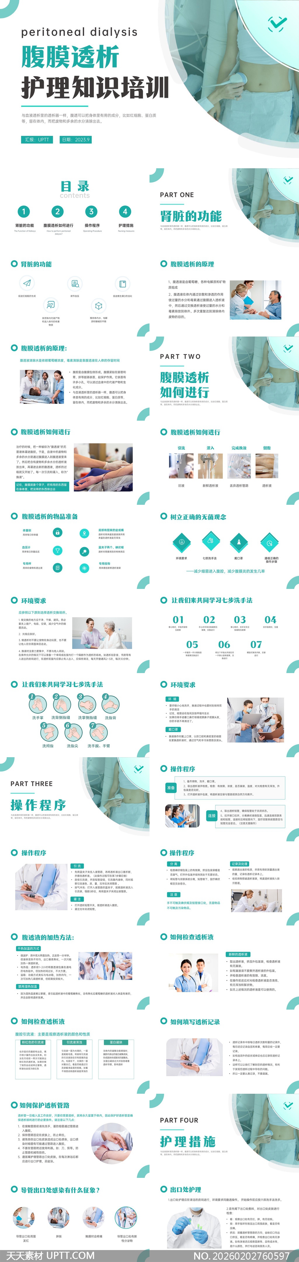 本PPT模板采用清新蓝白医疗配色与高清临床实拍图结合,涵盖腹膜透析原理、操作流程、无菌规范及七步洗手法等核心内容;适用于医院护理部岗前培训、科室业务学习、医学院教学演示及继续教育考核场景,兼具专业性与可视化表达,助力医护人员高效掌握标准化操作要领与感染防控细节。【 素材唯一编号 20260202760597 】,简约类蓝色风格PPTX格式素材下载,文件格式为.PPTX,下载完成后的文件为一个压缩包,素材压缩包大小5.42 MB,请解压后用相应软件打开。