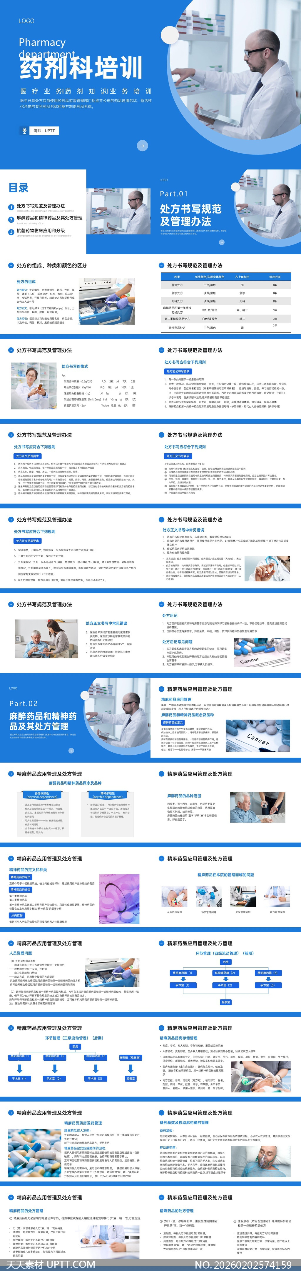 本PPT模板专为药剂科专业培训设计,采用蓝白主色调搭配高清医疗实景图与规范图表,视觉专业清爽;内容结构清晰,涵盖处方书写要点、常见错误辨析、精麻药品分类管理及全流程操作规范,并融入真实临床案例与流程图解,强化实操指导性;适用于医院内部岗前培训、继续教育考核、药事质控会议及新员工带教等场景,助力医疗机构高效开展标准化药学管理能力建设。【 素材唯一编号 20260202574159 】,简约类蓝色风格PPTX格式素材下载,文件格式为.PPTX,下载完成后的文件为一个压缩包,素材压缩包大小8.03 MB,请解压后用相应软件打开。