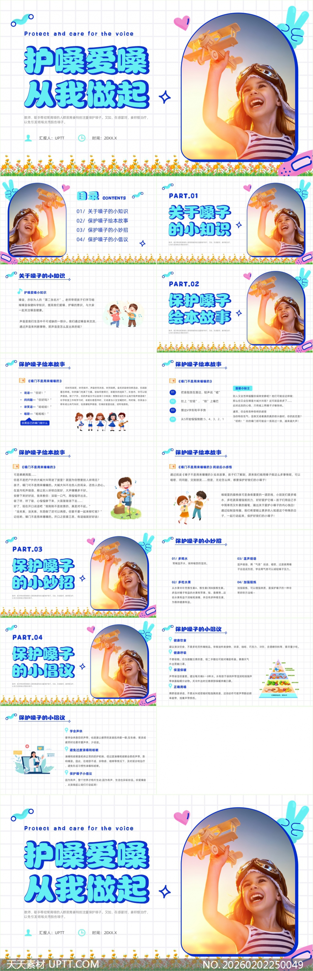 本PPT模板采用清新活泼的插画风格,以阳光童趣的航空主题贯穿始终,搭配明快配色与手绘元素,增强儿童参与感与视觉吸引力;涵盖嗓音科学知识、绘本式情景故事、实用护嗓妙招及日常倡议四大模块,融合互动问答、行为引导与健康饮食图示,适合幼儿园、小学健康课堂、社区科普讲座及家长学校使用,助力教师与医护人员生动开展嗓音保护宣教,让专业健康知识在轻松氛围中入脑入心。【 素材唯一编号 20260202250049 】,卡通类蓝色风格PPTX格式素材下载,文件格式为.PPTX,下载完成后的文件为一个压缩包,素材压缩包大小18.98 MB,请解压后用相应软件打开。