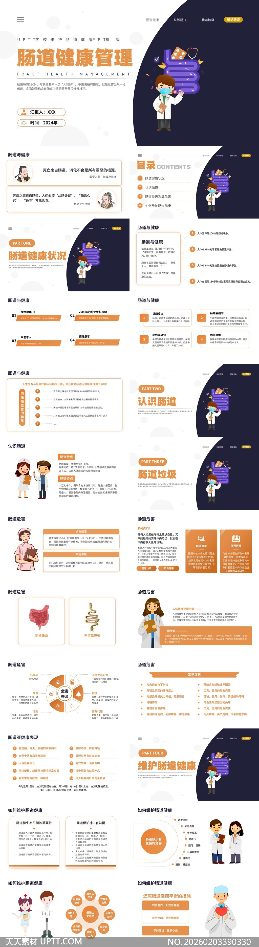 本PPT模板采用清新专业的医疗插画风格,以紫色为主色调搭配橙色点缀,视觉统一且富有亲和力;内容结构清晰分为肠道健康现状、认知、危害与维护四大模块,融合权威数据、中西医观点及生活化案例,辅以信息图、流程图与对比图提升信息传达效率;适用于医院健康宣教、社区科普讲座、医学院教学及企业员工健康管理培训等场景,兼具科学性与可读性,助力专业人员高效开展肠道健康知识普及工作。【 素材唯一编号 20260203390330 】,简约类黄色风格PPTX格式素材下载,文件格式为.PPTX,下载完成后的文件为一个压缩包,素材压缩包大小8.34 MB,请解压后用相应软件打开。
