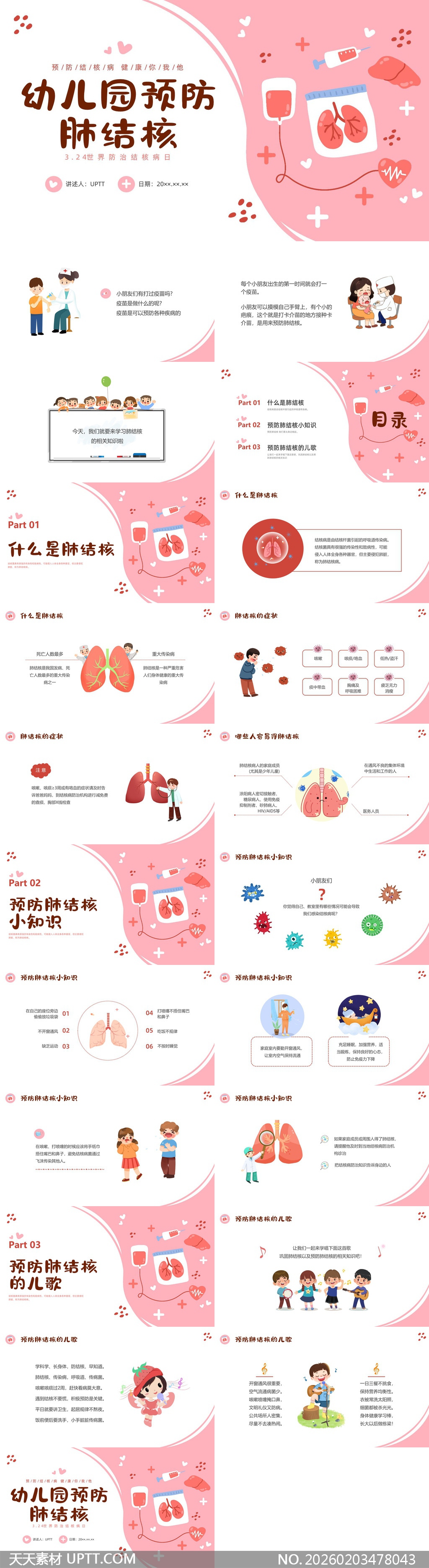 本PPT模板采用温馨可爱的卡通插画风格,以粉嫩主色调搭配简洁线条与童趣元素,契合幼儿认知特点;内容结构清晰分为肺结核认知、预防小知识及儿歌互动三部分,融入医生问诊、疫苗接种、症状识别等场景化图示,并穿插互动提问与朗朗上口的健康儿歌,增强参与感;适用于幼儿园健康教育课、社区儿童保健宣讲或疾控机构科普进校园活动,助力教师轻松开展寓教于乐的传染病防控启蒙教育。【 素材唯一编号 20260203478043 】,简约类红色风格PPTX格式素材下载,文件格式为.PPTX,下载完成后的文件为一个压缩包,素材压缩包大小5.2 MB,请解压后用相应软件打开。