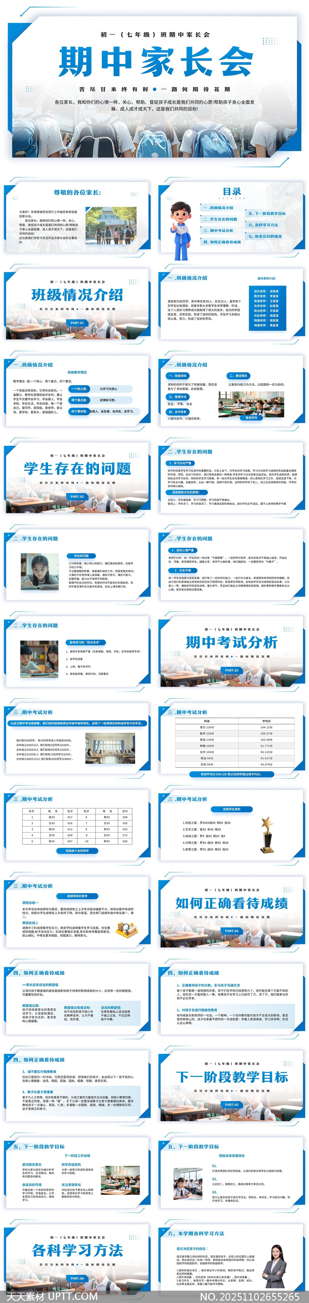 本PPT模板专为初中期中家长会设计,融合简洁大气的蓝白配色与清晰的数据图表,突出班级整体情况、学生成绩分析及教学规划等内容,助力教师高效呈现教学成果与改进方向。模板包含学生问题剖析、考试数据可视化、科学学习方法指导等实用板块,适用于学期中期家校沟通场景,帮助家长全面了解孩子学习状态,增强教育合力,提升家校共育效果。【 素材唯一编号 20251102655265 】,简约类蓝色风格PPTX格式素材下载,文件格式为.PPTX,下载完成后的文件为一个压缩包,素材压缩包大小33.6 MB,请解压后用相应软件打开。