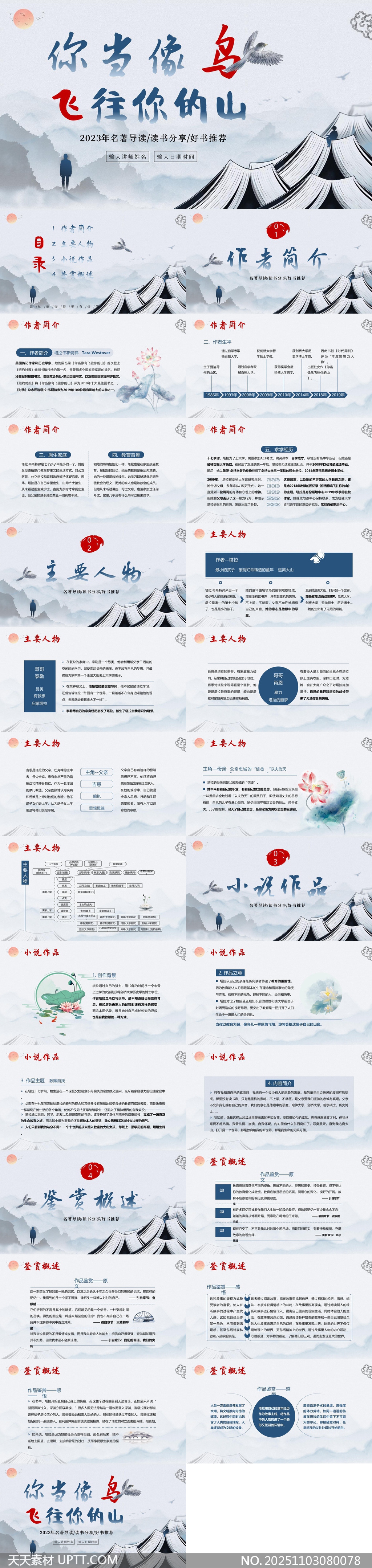 该PPT模板以中国传统水墨山水为背景,融合古典建筑与书法元素,营造出浓厚的东方美学氛围,适用于读书分享会、名著导读、好书推荐等文化类活动场景。设计中巧妙运用红色印章、飞鸟意象与古风字体,突出“你当像鸟飞往你的山”主题,兼具视觉美感与内容逻辑性,页面布局清晰,信息层次分明,适合教师、学生及文化机构进行阅读推广与作品解析展示,提升演讲的专业性与艺术感。【 素材唯一编号 20251103080078 】,中国风类蓝色风格PPTX格式素材下载,文件格式为.PPTX,下载完成后的文件为一个压缩包,素材压缩包大小13.97 MB,请解压后用相应软件打开。