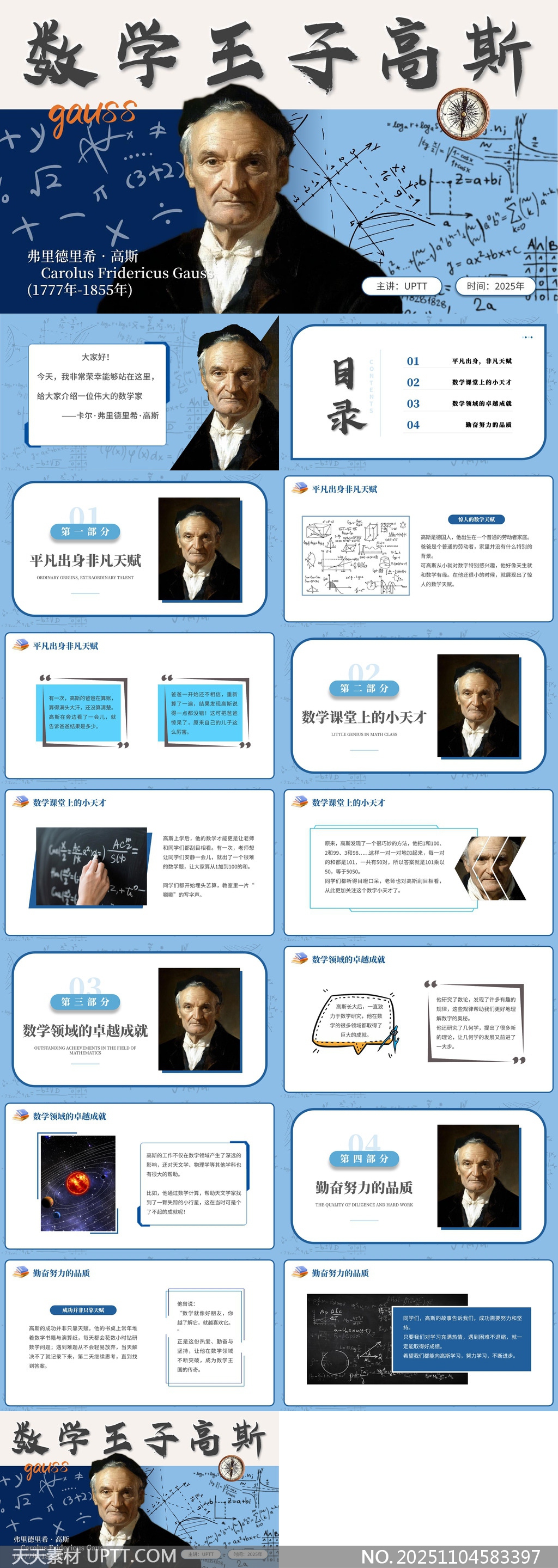 本PPT模板以数学巨匠高斯生平为主题,采用蓝白配色与数学公式背景,融合历史人物肖像与简洁图文排版,展现其非凡天赋、学术成就与勤奋品质。设计风格专业大气,适用于中小学数学课、科普讲座或人物事迹分享场景,帮助用户生动讲述高斯的成长故事与科学精神,提升演示表现力与教育感染力。【 素材唯一编号 20251104583397 】,简约类蓝色风格PPTX格式素材下载,文件格式为.PPTX,下载完成后的文件为一个压缩包,素材压缩包大小121.59 MB,请解压后用相应软件打开。