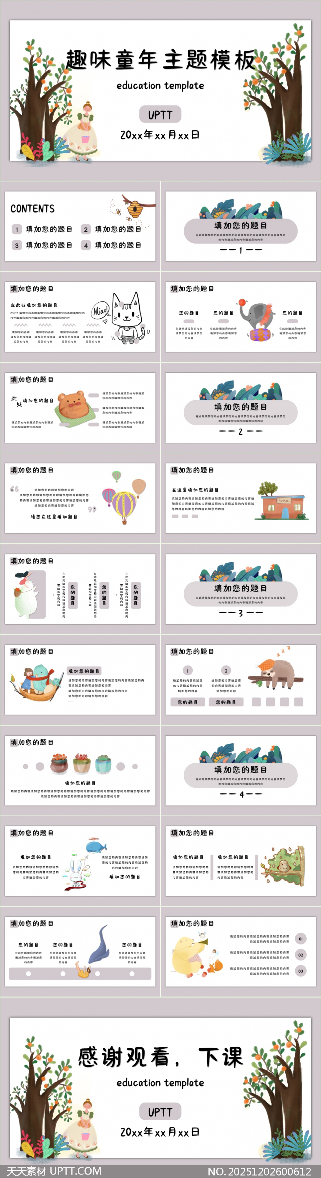 这款PPT模板以温馨手绘风打造童趣盎然的视觉体验,融入猫咪、大象、树懒等萌趣动物角色与自然元素,色彩柔和布局清晰,内置多款内容排版页与目录导航,完美适配幼儿园课堂、儿童科普讲解及亲子互动教学场景,帮助教师轻松制作生动有趣的课件,激发孩子学习兴趣,让知识传递更富温度与创意。【 素材唯一编号 20251202600612 】,卡通类彩色风格PPTX格式素材下载,文件格式为.PPTX,下载完成后的文件为一个压缩包,素材压缩包大小13.42 MB,请解压后用相应软件打开。