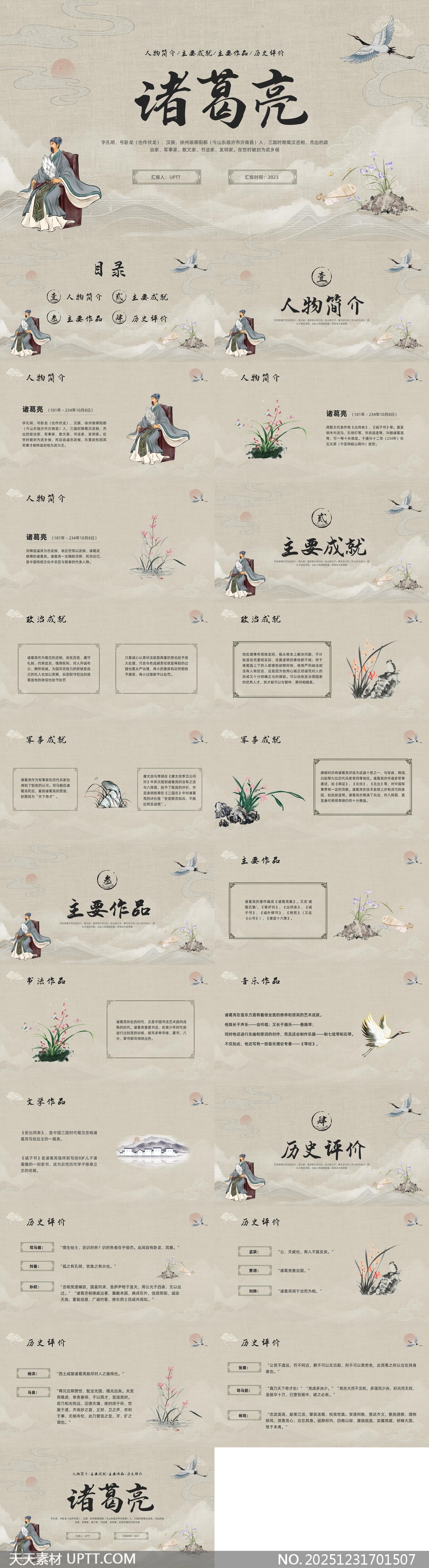 这款古风手绘风格PPT模板以淡雅水墨为基调,融合仙鹤、兰草、卷轴等传统元素,生动再现诸葛亮生平事迹,结构清晰涵盖人物简介、成就、作品与历史评价四大模块,适配文化讲座、历史课件、主题汇报等场景,既具艺术美感又富教育内涵,助您轻松打造沉浸式国风演示体验。【 素材唯一编号 20251231701507 】,中国风类黑白灰风格PPTX格式素材下载,文件格式为.PPTX,下载完成后的文件为一个压缩包,素材压缩包大小11.56 MB,请解压后用相应软件打开。