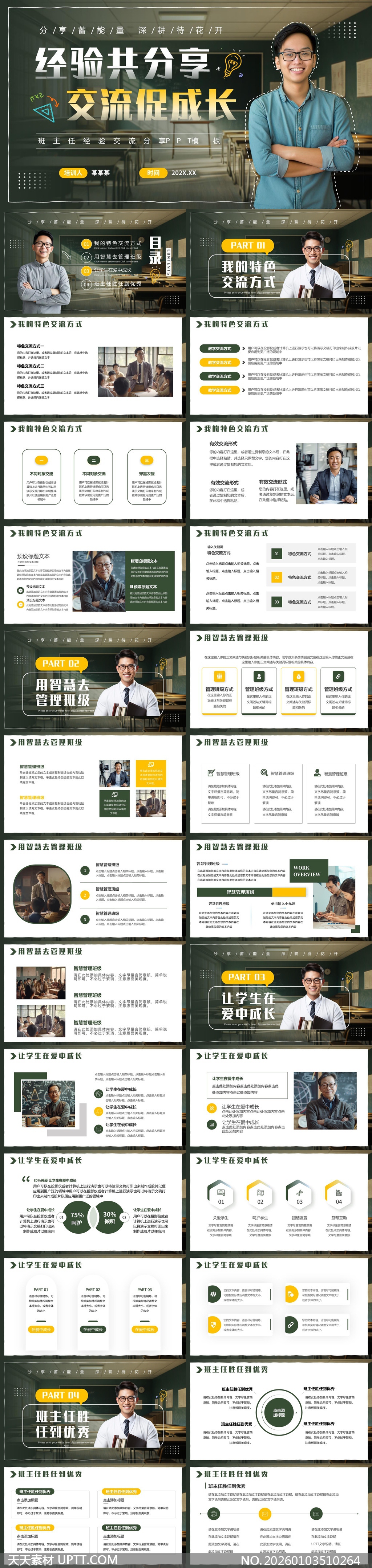 这款PPT模板专为教育工作者打造,采用沉稳绿与暖黄搭配,视觉专业又不失亲和力,内含“特色交流方式”“智慧管理班级”“爱中成长”“胜任优秀”四大模块,结构清晰逻辑严谨,每页均配教师实景图与可编辑图文框,支持一键替换内容,适用于班主任经验分享会、校本培训、德育研讨会等场景,助您高效呈现育人智慧,提升汇报专业度与感染力。【 素材唯一编号 20260103510264 】,简约类绿色风格PPTX格式素材下载,文件格式为.PPTX,下载完成后的文件为一个压缩包,素材压缩包大小27.45 MB,请解压后用相应软件打开。