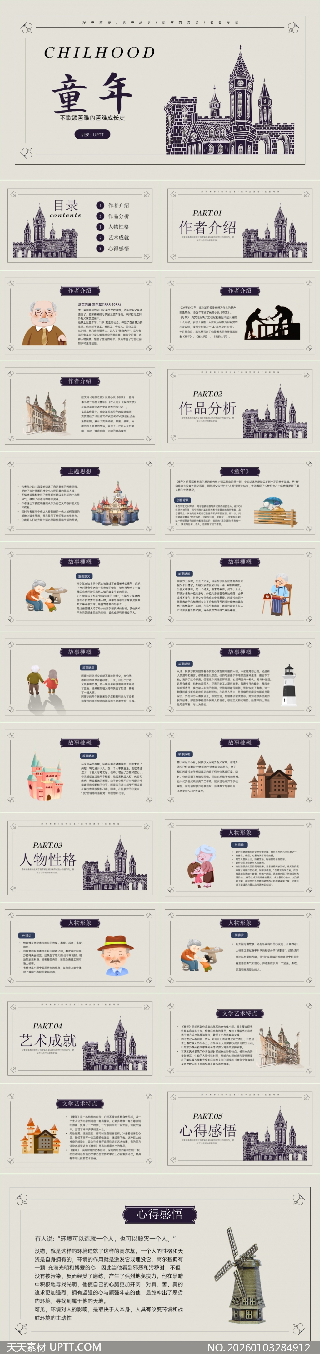 本PPT模板以复古手绘城堡与插画风格呈现高尔基《童年》的苦难成长主题,内容涵盖作者生平、作品思想、人物性格剖析及艺术成就,结构清晰逻辑严谨,适配语文课堂讲授、名著导读分享或文学研讨会场景,助力教师与学生深入理解经典文本的社会批判性与人性光辉,提升教学表现力与阅读感悟深度。【 素材唯一编号 20260103284912 】,插画类黑白灰风格PPTX格式素材下载,文件格式为.PPTX,下载完成后的文件为一个压缩包,素材压缩包大小9.65 MB,请解压后用相应软件打开。