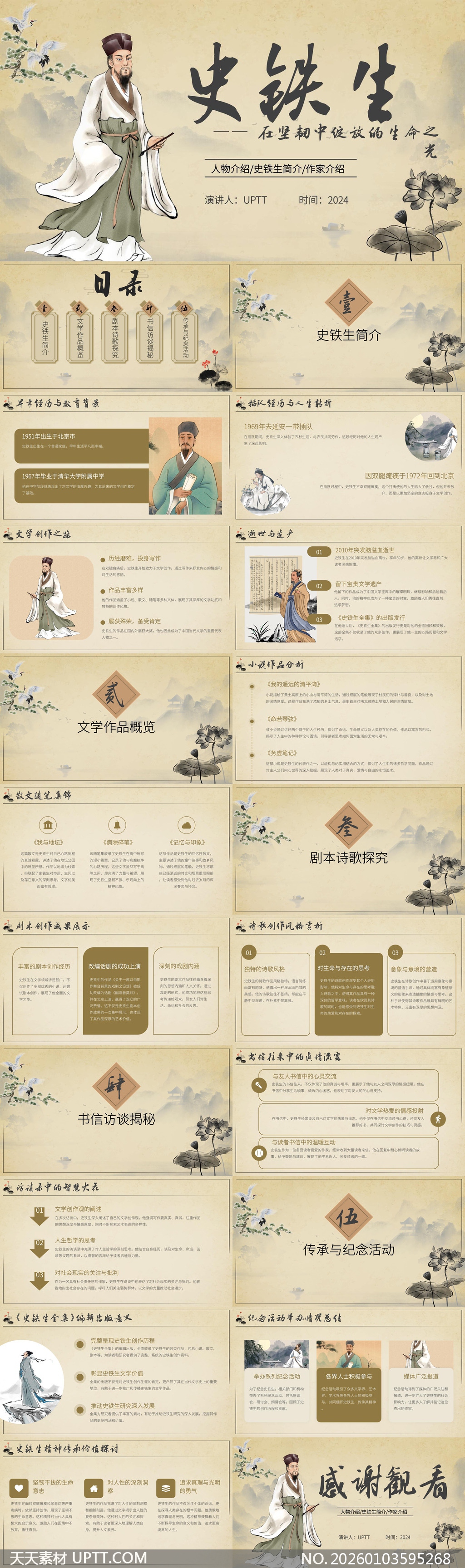 本PPT模板以水墨丹青与古典雅致风格,深度呈现史铁生从坎坷人生到文学巅峰的完整脉络,涵盖其小说、散文、剧本及书信中的哲思精华,适配高校文学课、作家研究汇报、文化讲座等场景,助力用户系统梳理其生命韧性、人性洞察与存在之问,是传递人文精神与文学价值的理想视觉载体。【 素材唯一编号 20260103595268 】,中国风类黄色风格PPTX格式素材下载,文件格式为.PPTX,下载完成后的文件为一个压缩包,素材压缩包大小13.05 MB,请解压后用相应软件打开。