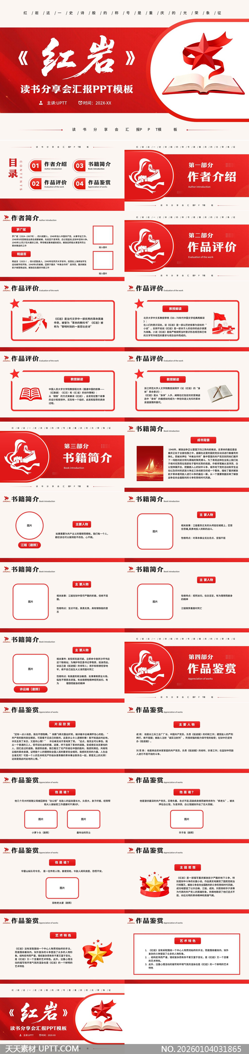 本PPT模板以炽热红色为主调,融合五角星、翻开的书本与革命剪影等视觉元素,庄重而不失设计感,专为《红岩》主题读书分享、思政课堂汇报及红色文化宣讲打造,内含作者介绍、作品评价、人物鉴赏与艺术特色等完整结构模块,排版清晰逻辑严谨,既适合高校师生深度解读经典,也适配企事业单位党建活动,助力用户高效呈现红色精神内核与文学价值。【 素材唯一编号 20260104031865 】,党建类红色风格PPTX格式素材下载,文件格式为.PPTX,下载完成后的文件为一个压缩包,素材压缩包大小13.64 MB,请解压后用相应软件打开。
