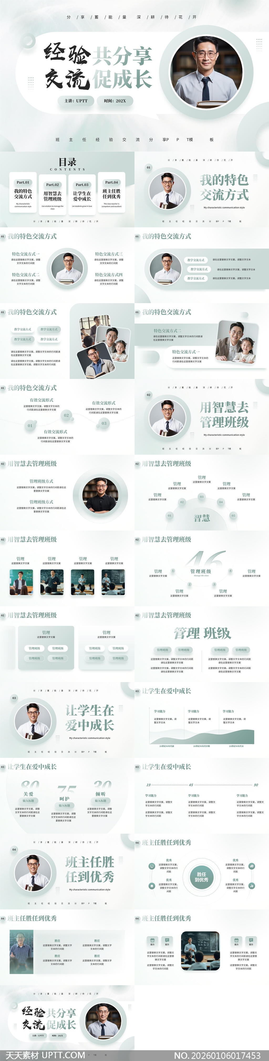 这款PPT模板以清新雅致的薄荷绿为主色调,搭配简约圆角与留白设计,营造专业而不失亲和力的视觉氛围;内含“特色交流方式”“智慧管理班级”“爱中成长”“胜任到优秀”四大模块,非常适合班主任经验分享会、校本培训、德育研讨会等教育场景,助力教师高效呈现育人智慧与管理成果。【 素材唯一编号 20260106017453 】,简约类绿色风格PPTX格式素材下载,文件格式为.PPTX,下载完成后的文件为一个压缩包,素材压缩包大小7.07 MB,请解压后用相应软件打开。
