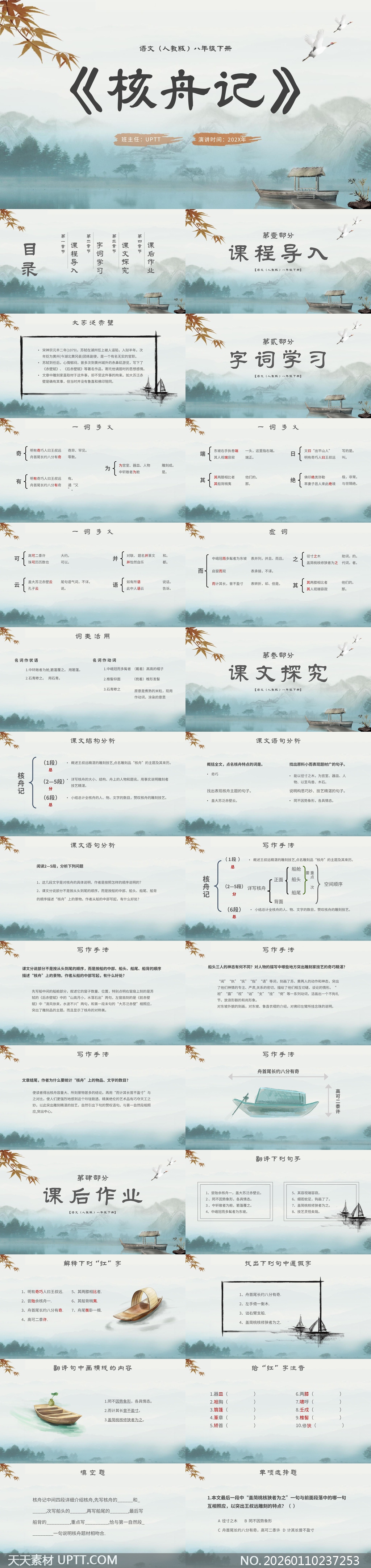 本PPT模板以水墨古风为基调,融合烟雨山水、扁舟飞鸟与枫叶点缀,营造出淡雅诗意的古典意境,完美契合《核舟记》文言文教学氛围;涵盖课程导入、字词解析、课文探究及课后作业等完整教学模块,适用于初中语文课堂讲授、公开课展示或教师备课,助力提升学生对文言文意境与技艺之美的感知力。【 素材唯一编号 20260110237253 】,中国风类蓝色风格PPTX格式素材下载,文件格式为.PPTX,下载完成后的文件为一个压缩包,素材压缩包大小15.49 MB,请解压后用相应软件打开。