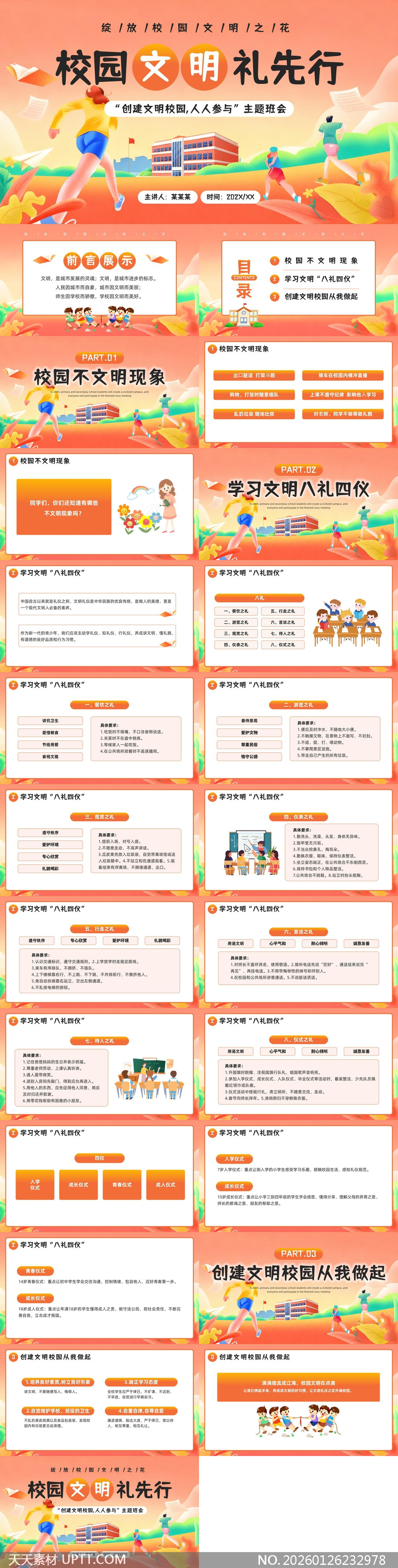本PPT模板以清新活力的插画风格呈现校园文明教育主题,采用橙粉渐变主色调搭配卡通学生形象与校园场景,视觉亲切生动;涵盖不文明现象辨析、“八礼四仪”分项详解(含餐饮、游览、观赏、仪表、行走、言谈、待人、仪式八大礼仪及四个成长阶段仪式)及实践倡议,便于教师引导讨论与互动教学;适用于中小学主题班会、德育课程、文明创建活动等场景,支持快速编辑替换,助力打造有温度、有深度的思政育人课堂。【 素材唯一编号 20260126232978 】,卡通类红色风格PPTX格式素材下载,文件格式为.PPTX,下载完成后的文件为一个压缩包,素材压缩包大小14.63 MB,请解压后用相应软件打开。