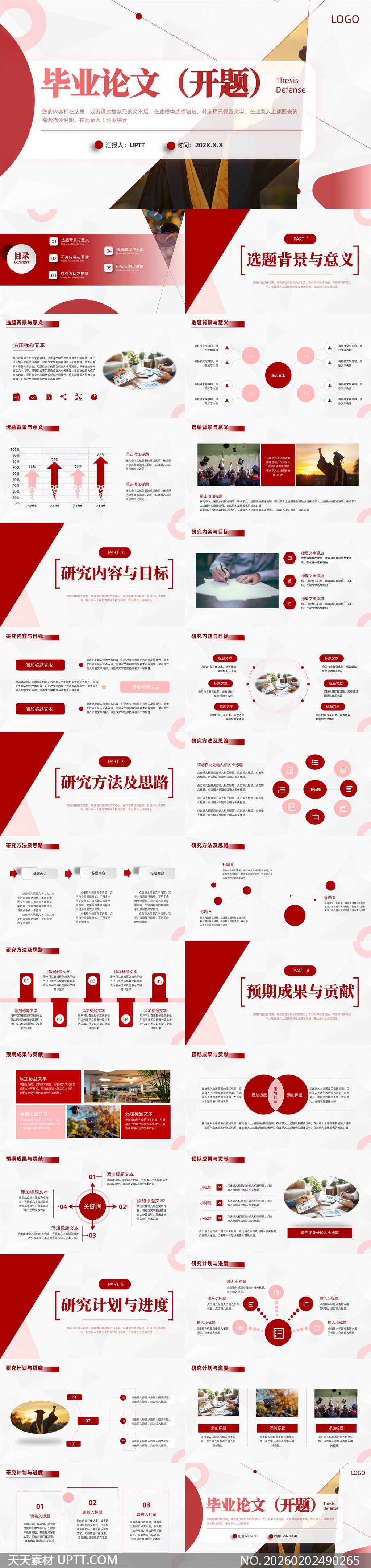 本模板采用红色主调搭配留白与几何线条,营造出庄重而不失现代感的学术氛围,分为选题背景、研究内容、方法思路、预期成果及研究计划五大模块;适用于高校本科生、硕博研究生毕业论文开题报告、中期答辩及课题申报等正式学术场合,兼顾专业性与视觉传达效率,助力用户高效完成高质量汇报材料。【 素材唯一编号 20260202490265 】,简约类红色风格PPTX格式素材下载,文件格式为.PPTX,下载完成后的文件为一个压缩包,素材压缩包大小11.49 MB,请解压后用相应软件打开。