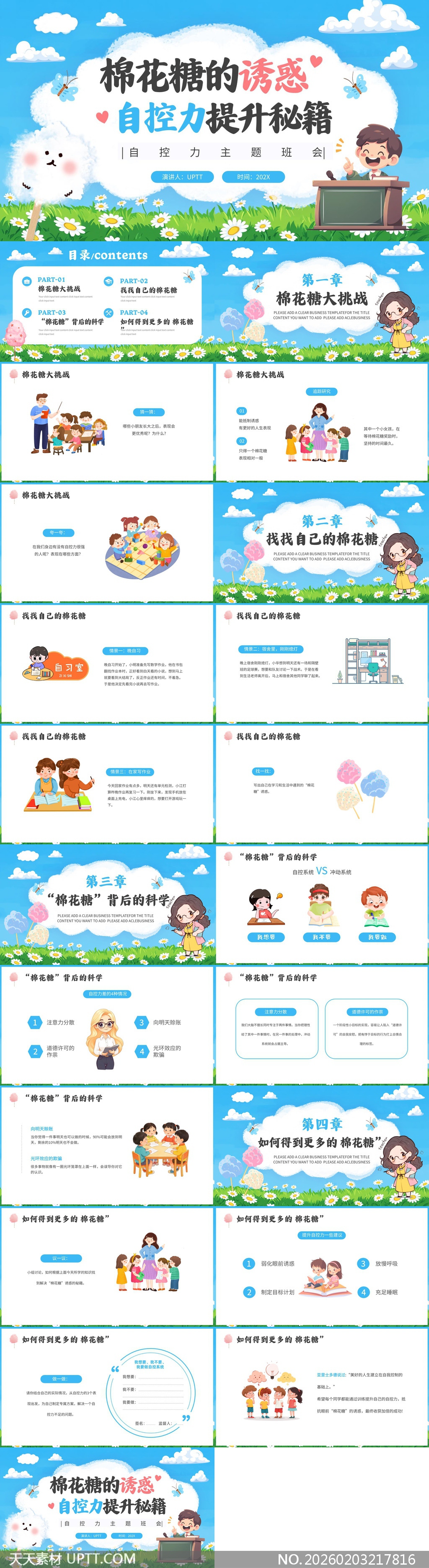 本PPT以清新童趣的棉花糖意象为视觉主线,融合手绘插画、云朵草地等柔和元素营造轻松氛围,巧妙将心理学原理转化为“棉花糖挑战”“自控四象限”“冲动VS自控系统对比”等互动式教学模块;含情景案例、小组讨论、自我反思与行动承诺环节,适配中小学班会课、心理健康教育及家庭教育指导场景,兼具科学性与趣味性,助力教师生动引导学生理解延迟满足、识别诱惑陷阱并实践自控策略,提升课堂参与度与教育实效。【 素材唯一编号 20260203217816 】,卡通类蓝色风格PPTX格式素材下载,文件格式为.PPTX,下载完成后的文件为一个压缩包,素材压缩包大小24.88 MB,请解压后用相应软件打开。