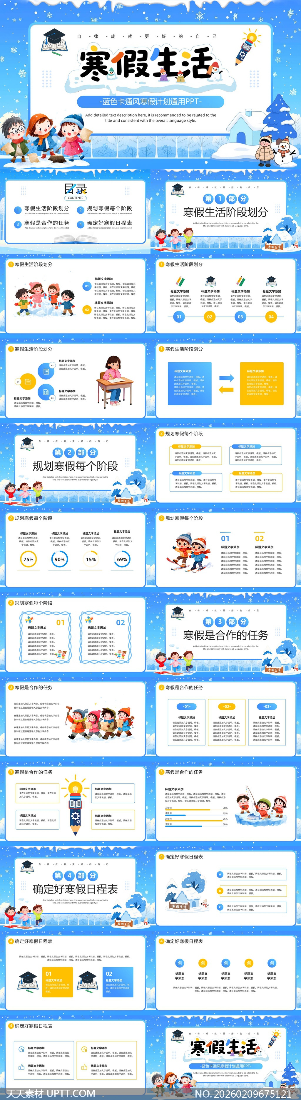 本模板采用清新蓝白配色与可爱卡通风插画,营造温馨冬日氛围,内含寒假阶段划分、任务规划、合作事项及日程表四大模块;适用于中小学生假期计划制定、家校协同管理、班级主题班会或家长会展示,兼具实用性与童趣感,帮助孩子科学安排学习与休闲,提升自律能力与时间管理意识,是寒假教育场景中高效又富吸引力的演示工具。【 素材唯一编号 20260209675121 】,卡通类蓝色风格PPTX格式素材下载,文件格式为.PPTX,下载完成后的文件为一个压缩包,素材压缩包大小31.35 MB,请解压后用相应软件打开。